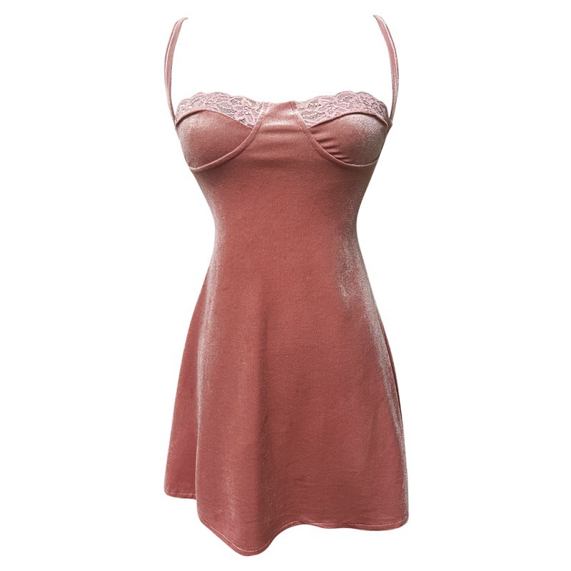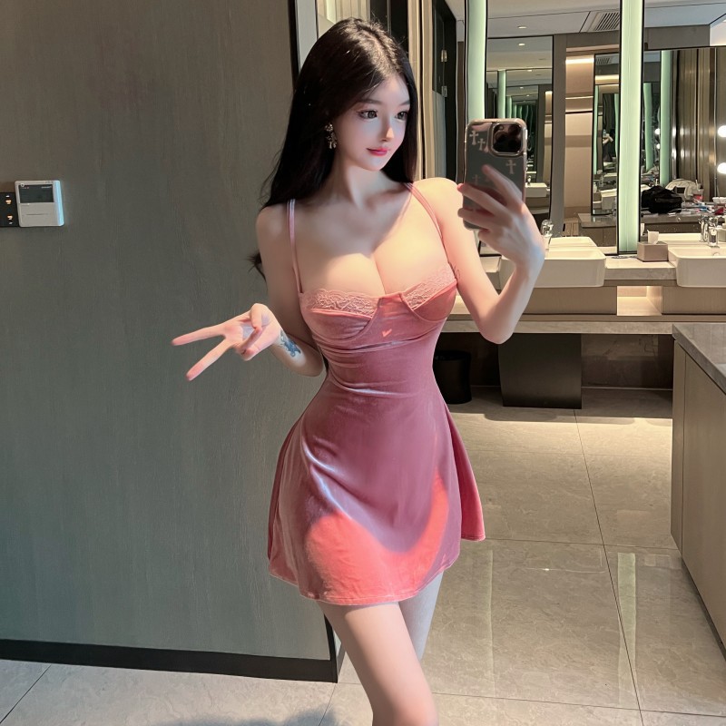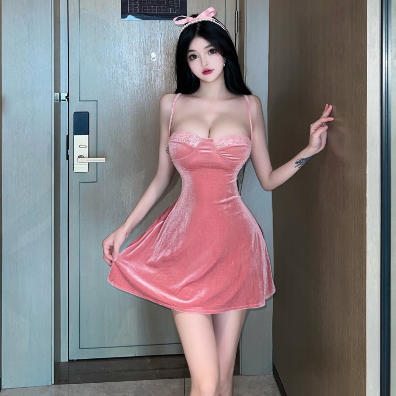 性感辣妹纯欲粉色丝绒吊带低胸蕾丝短裙收腰显瘦大摆a字连衣裙女