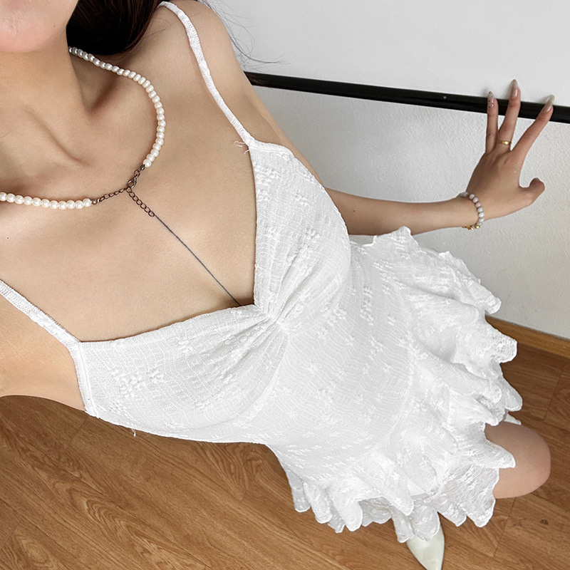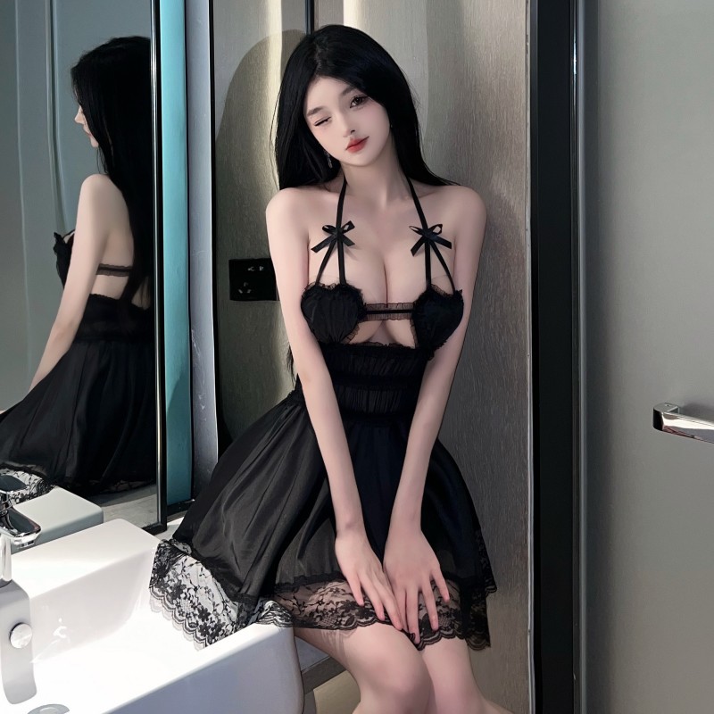 夜店性感纯欲吊带镂空露胸设计时尚爱心绸面蕾丝睡裙收腰连衣裙女