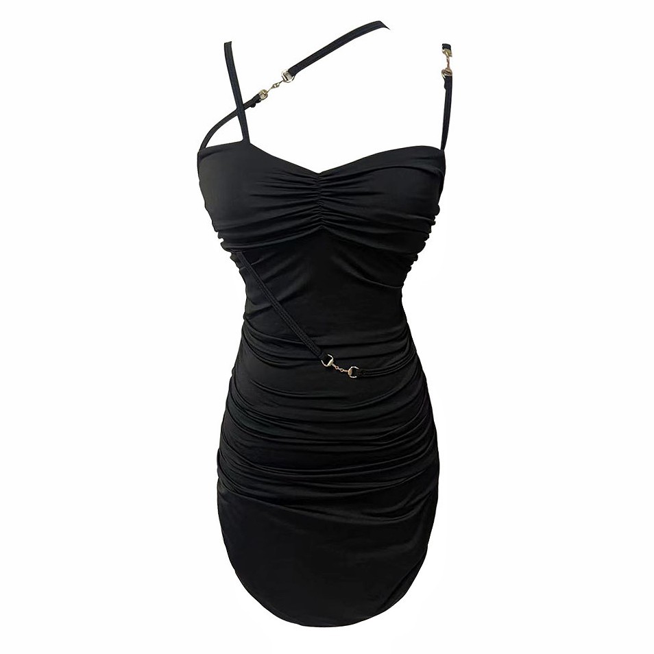 御姐性感风辣妹设计感吊带V领低胸收腰褶皱短裙紧身包臀连衣裙女