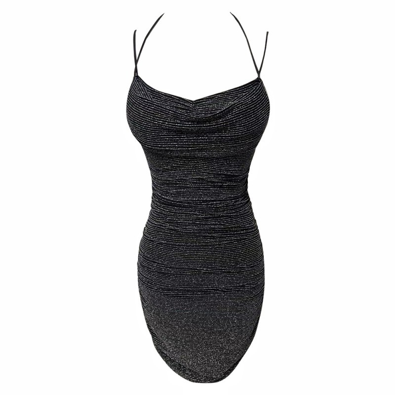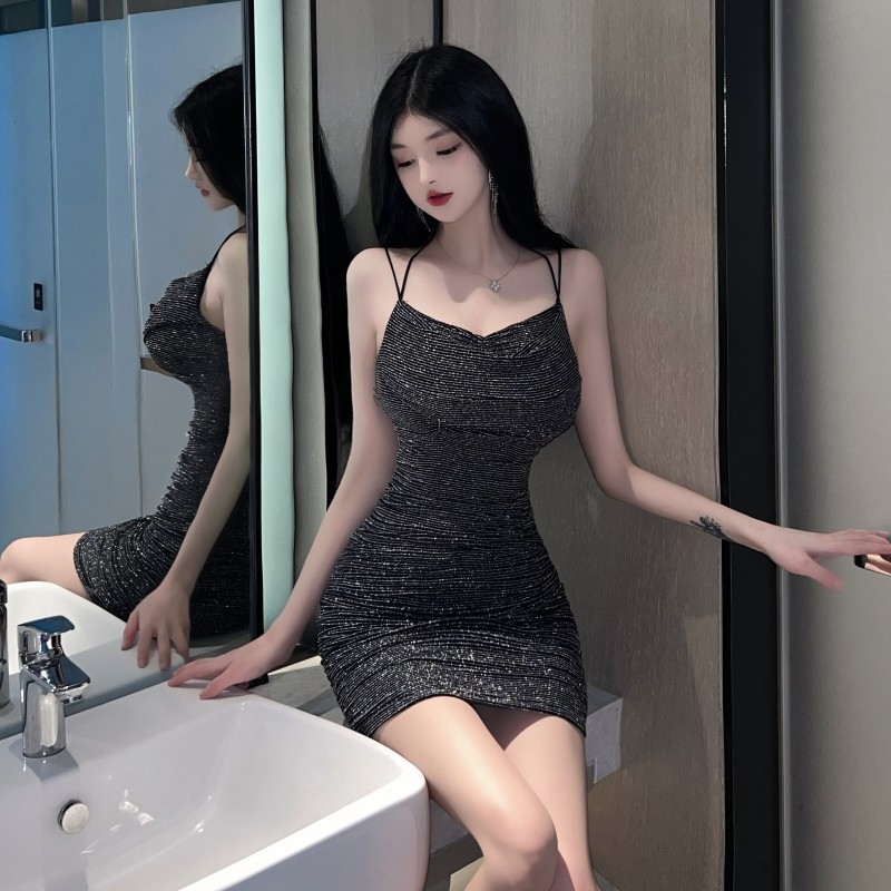 性感辣妹纯欲港风银丝吊带低胸细闪修身弹力短裙紧身包臀连衣裙女