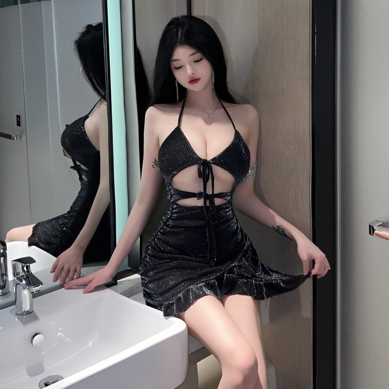 欧美性感风辣妹夜店交叉挂脖露胸镂空荷叶边短裙收腰显瘦连衣裙女