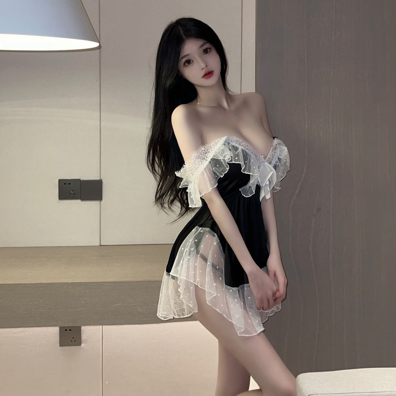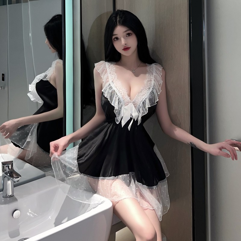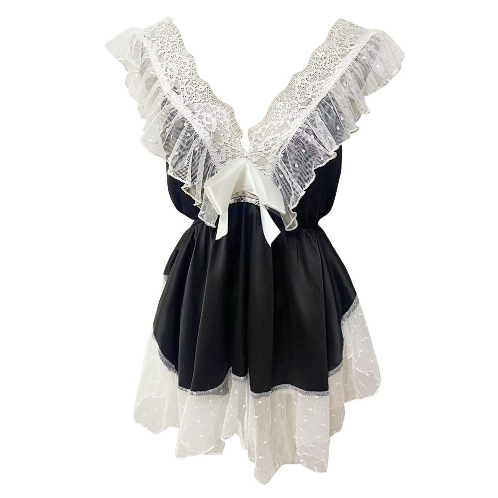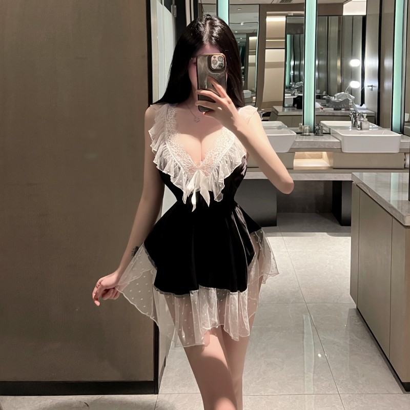 性感风诱惑纯欲辣妹深v领低胸超短裙修腰睡裙荷叶边蕾丝连衣裙女