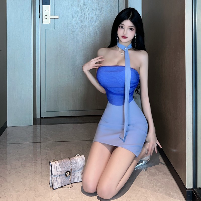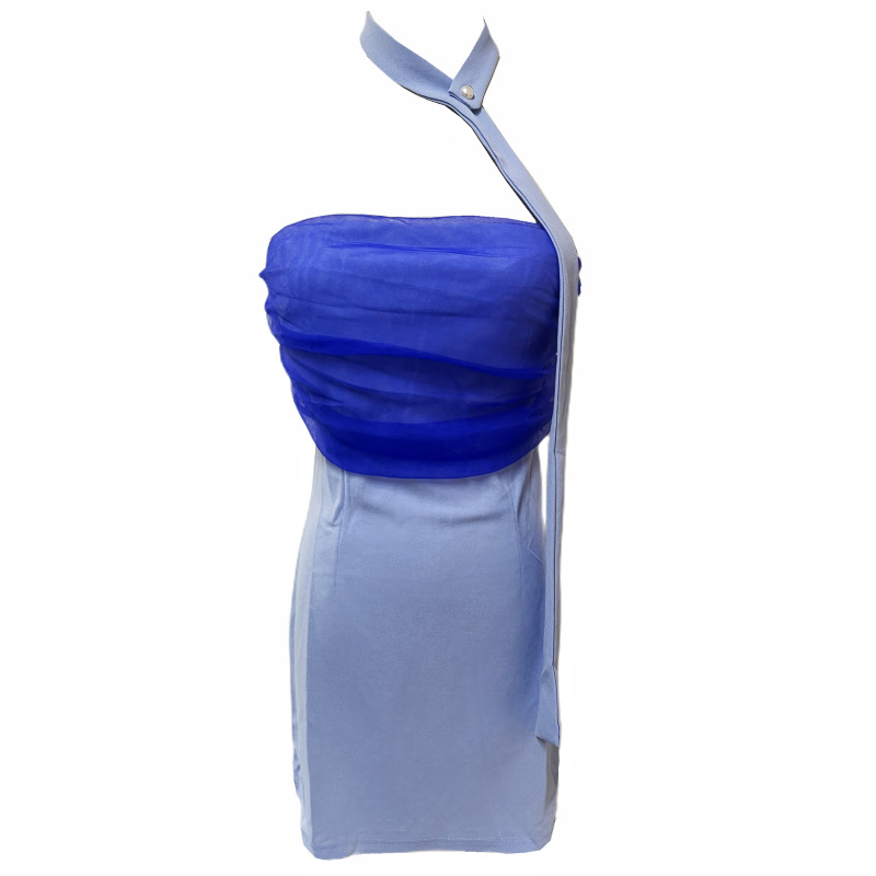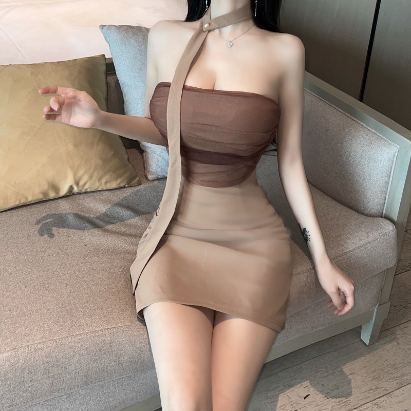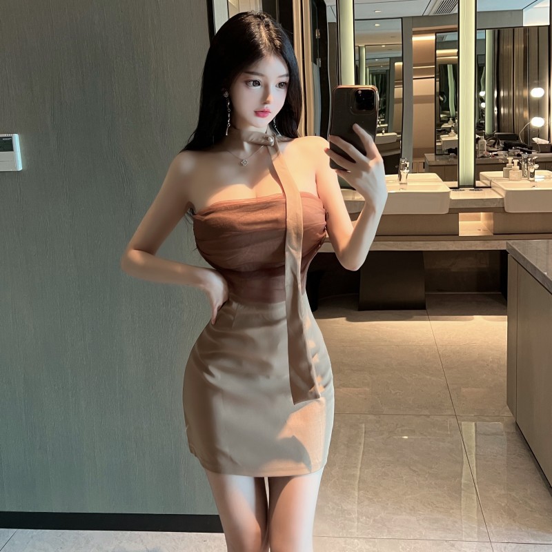 纯欲性感风名媛一字肩抹胸露背网纱拼接裹胸短裙紧身连衣裙女包臀