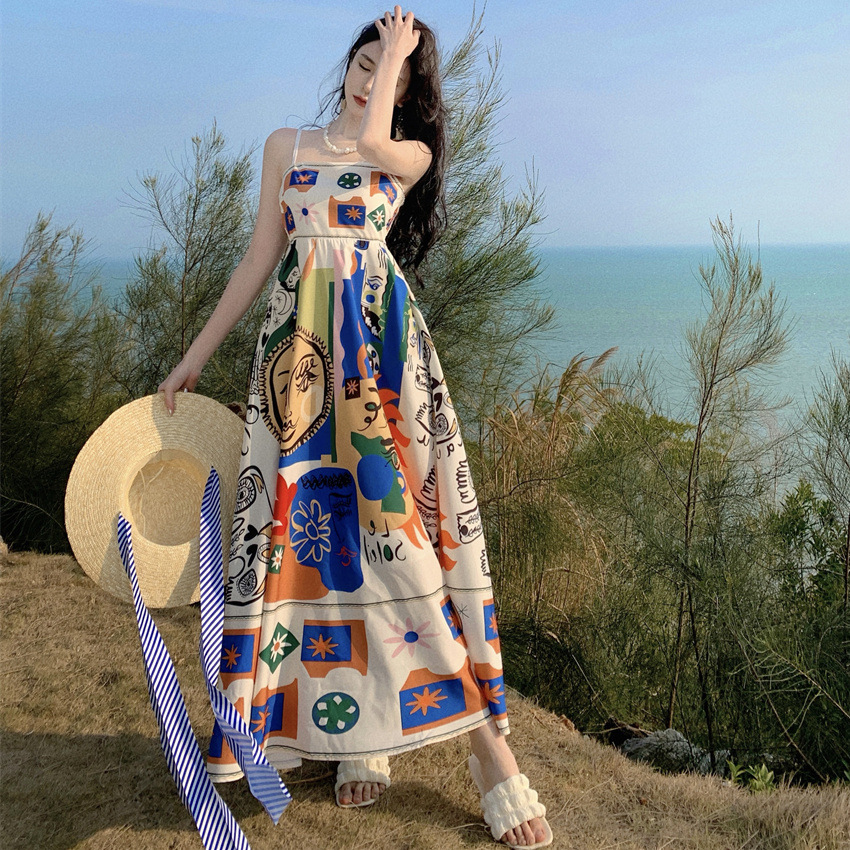 泰式彩色印花一字肩无袖沙滩长裙海边度假显瘦抹胸吊带连衣裙女夏