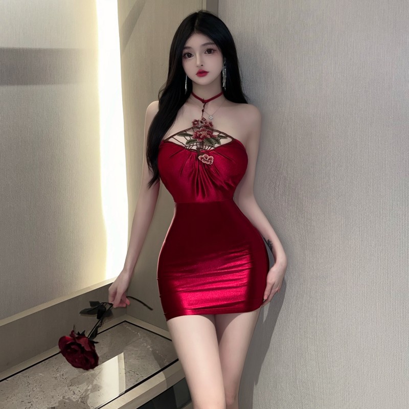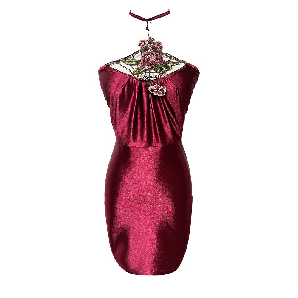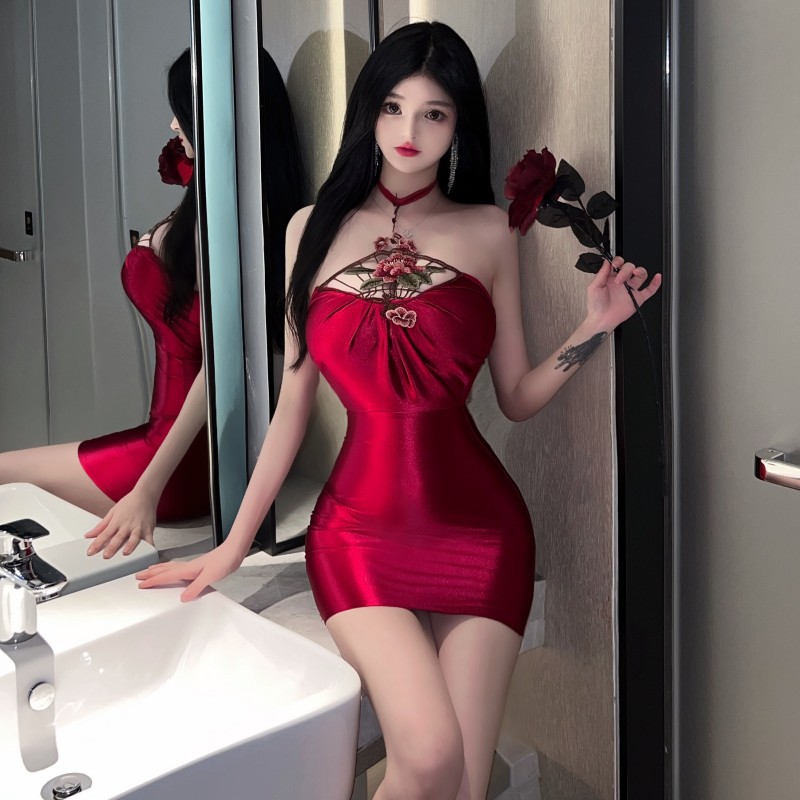 复古性感辣妹绣花立体镂空绸面短裙紧身包臀连衣裙女