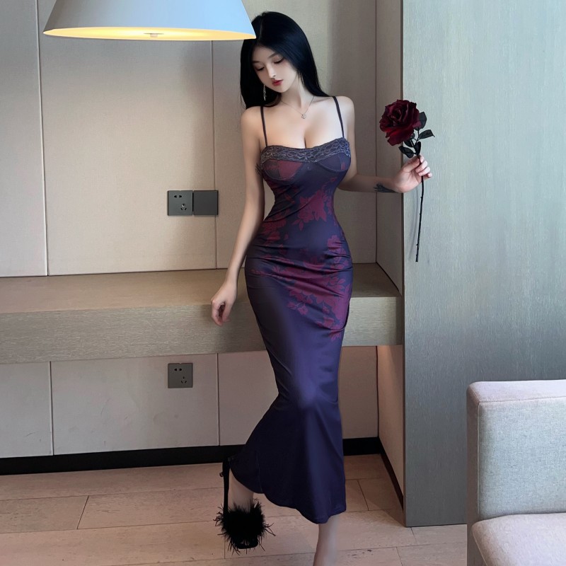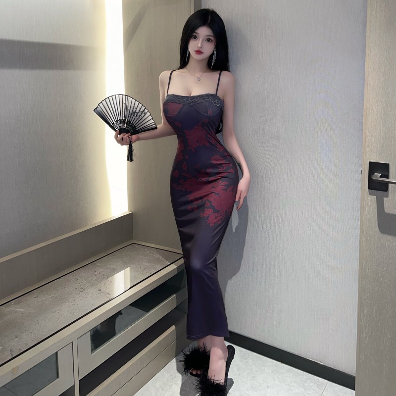性感辣妹夜店印花气质吊带修身包臀长裙礼服连衣裙女
