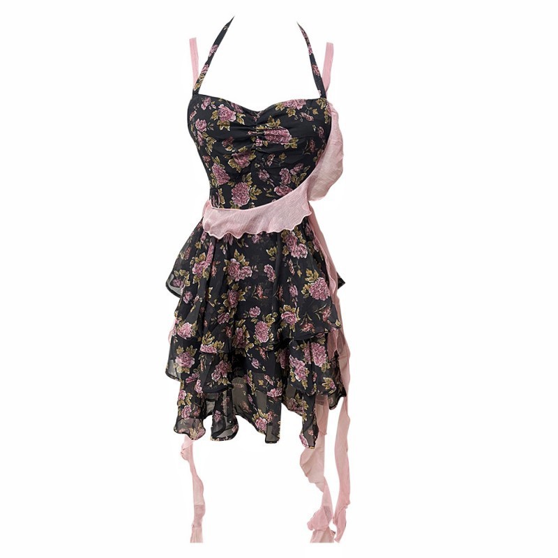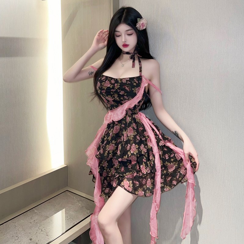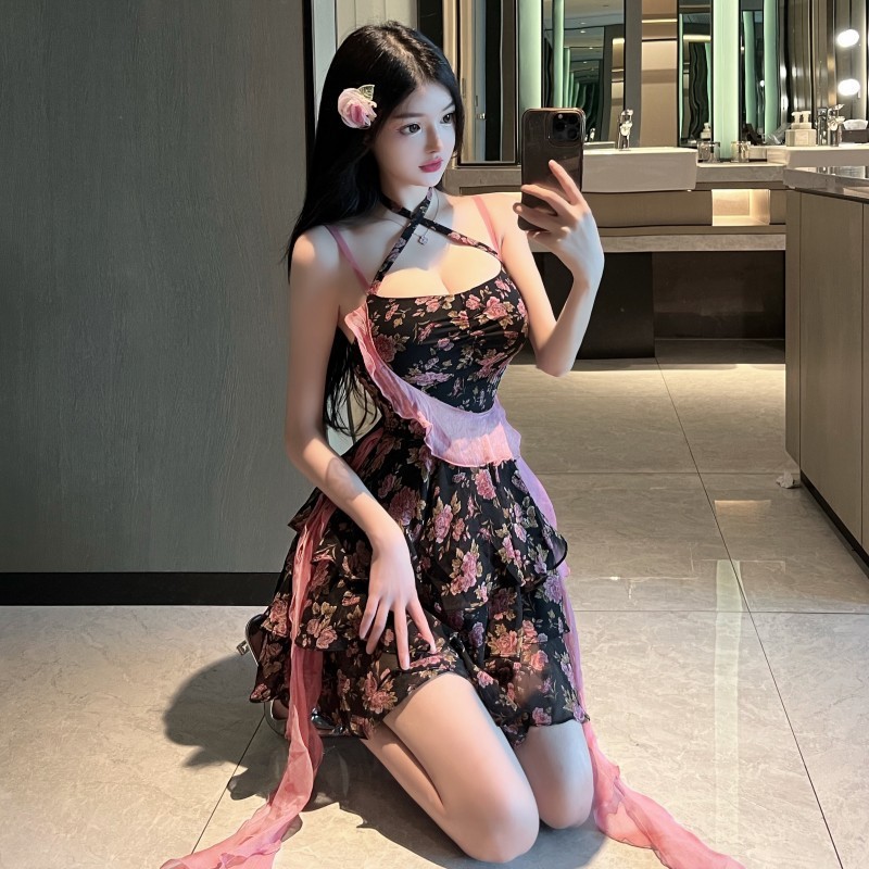 性感网红田园法式甜辣碎花公主雪纺收腰连衣裙女