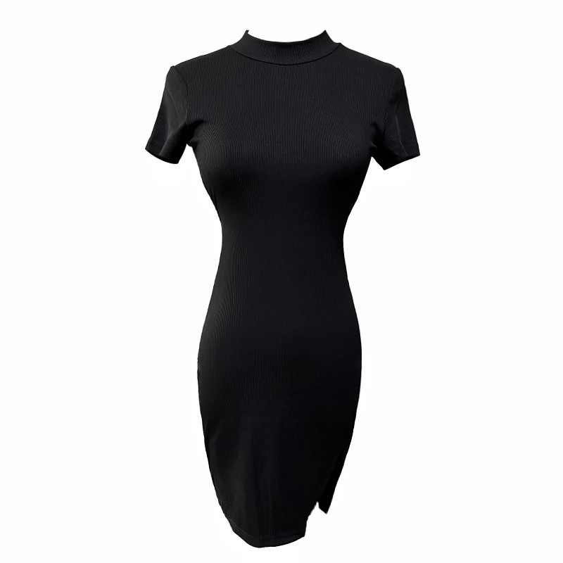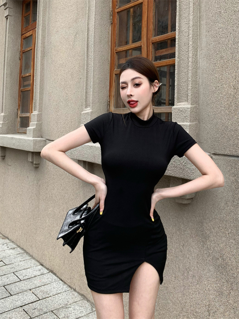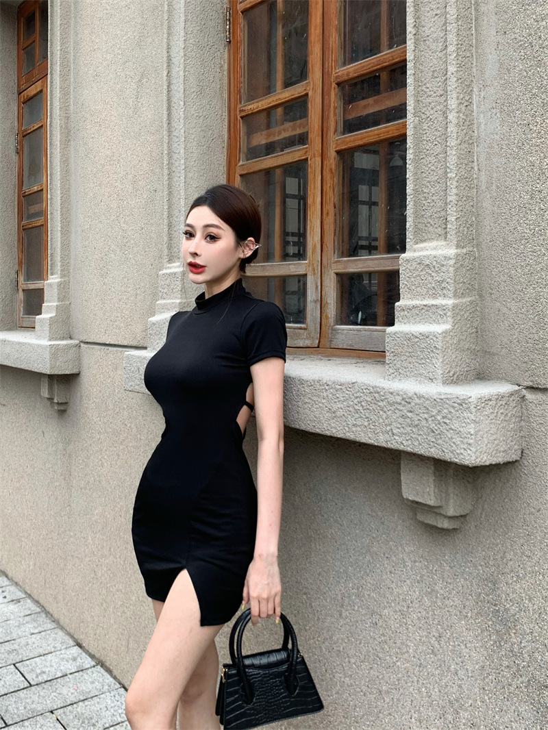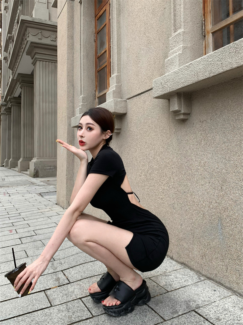 性感辣妹设计感圆领大露背系带开叉短袖连衣裙女