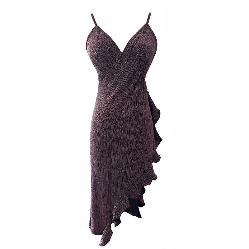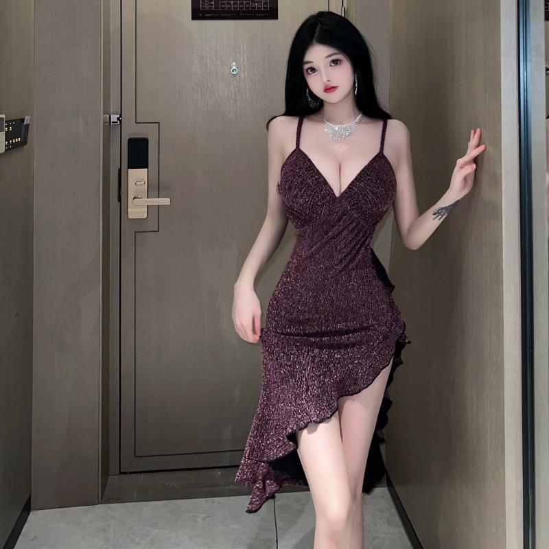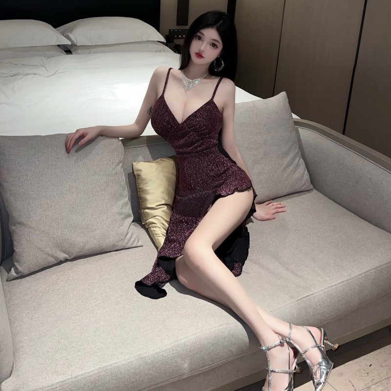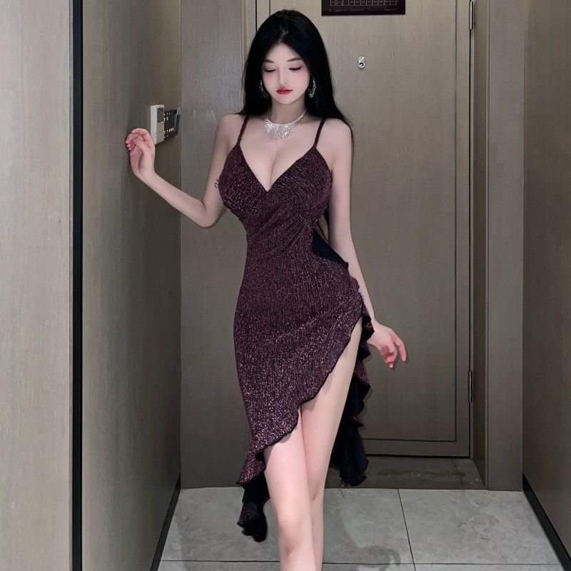 性感吊带亮丝修身显瘦开叉不规则荷叶边连衣裙女