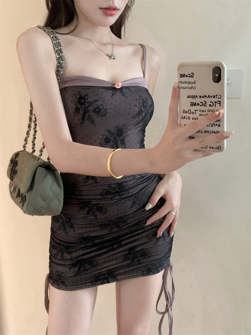 欧美纯欲蕾丝吊带花边双层性感辣妹包臀连衣裙女