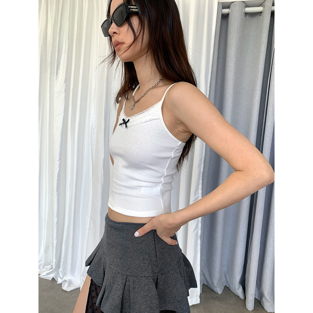 夏季新品韩国蝴蝶结蕾丝拼接吊带背心修身短款显瘦短款上衣