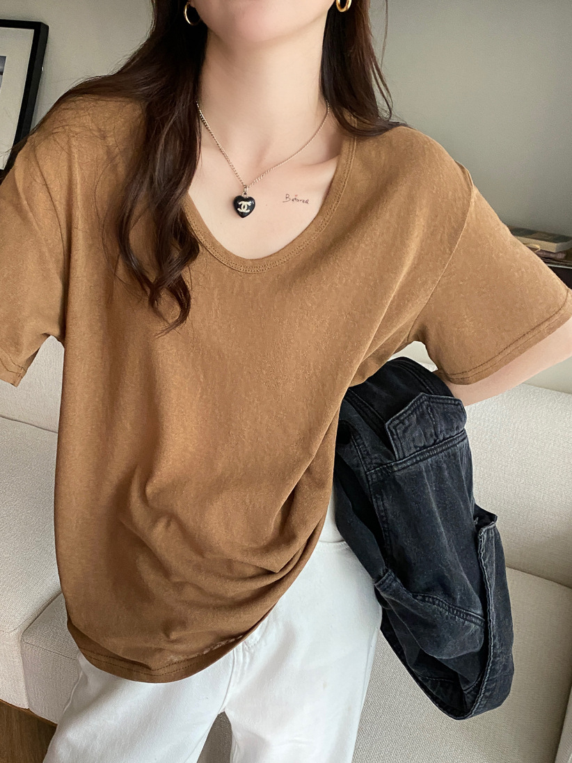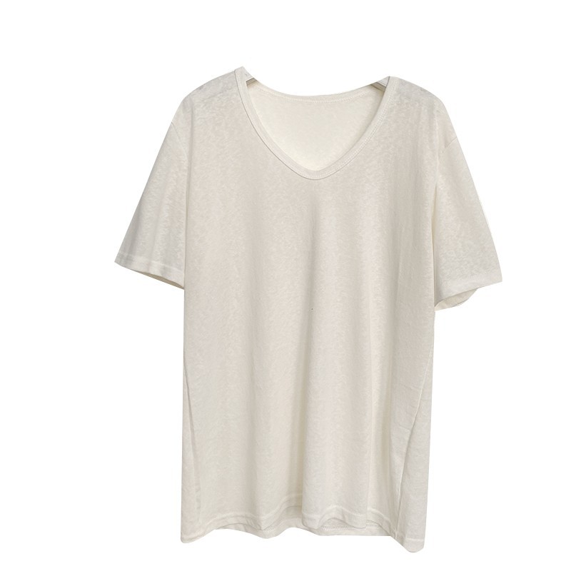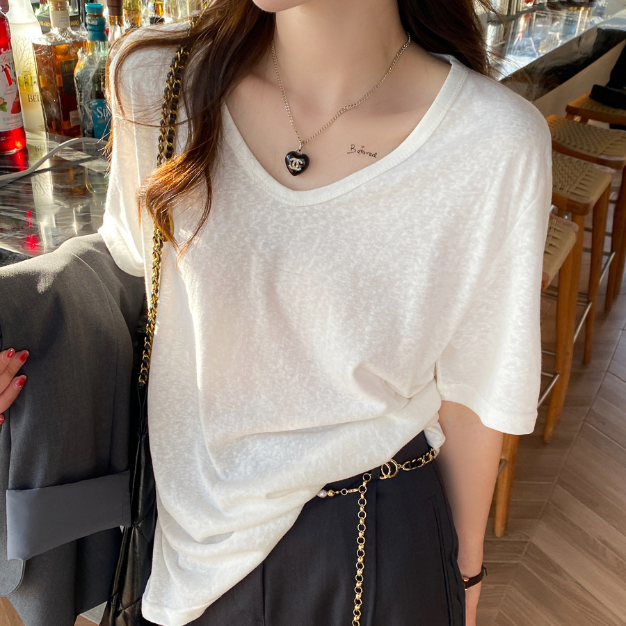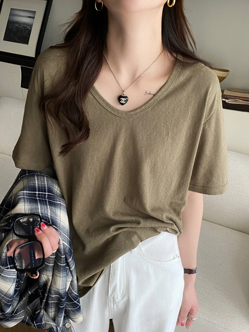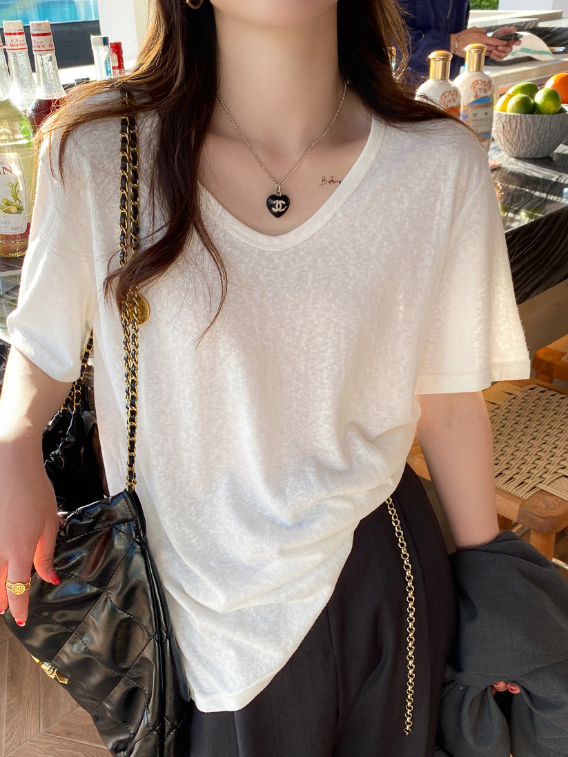 棉麻上衣女短袖夏季薄款年新款竹节棉v领t恤白色半袖纯色冰丝