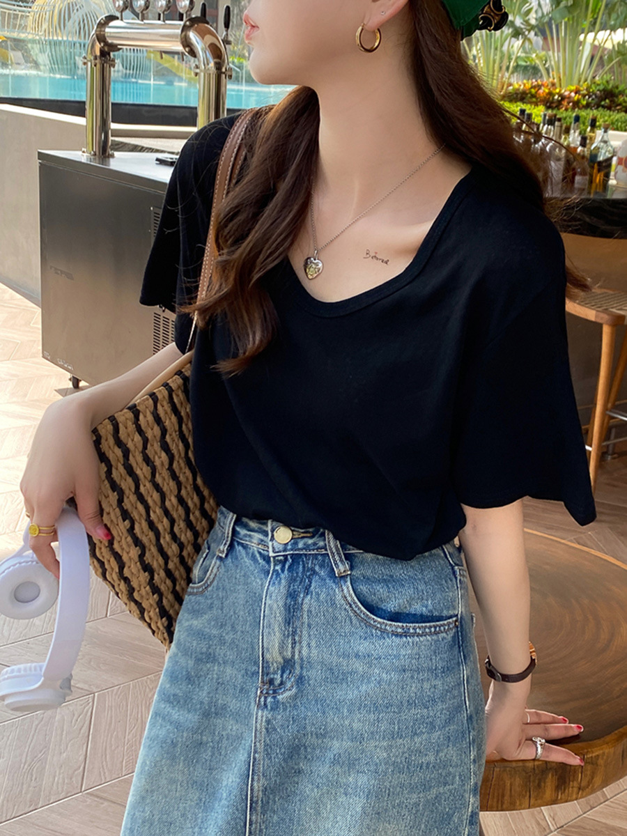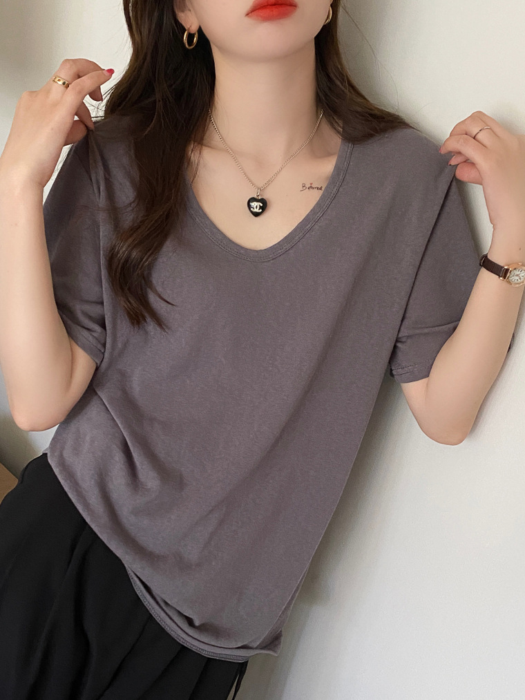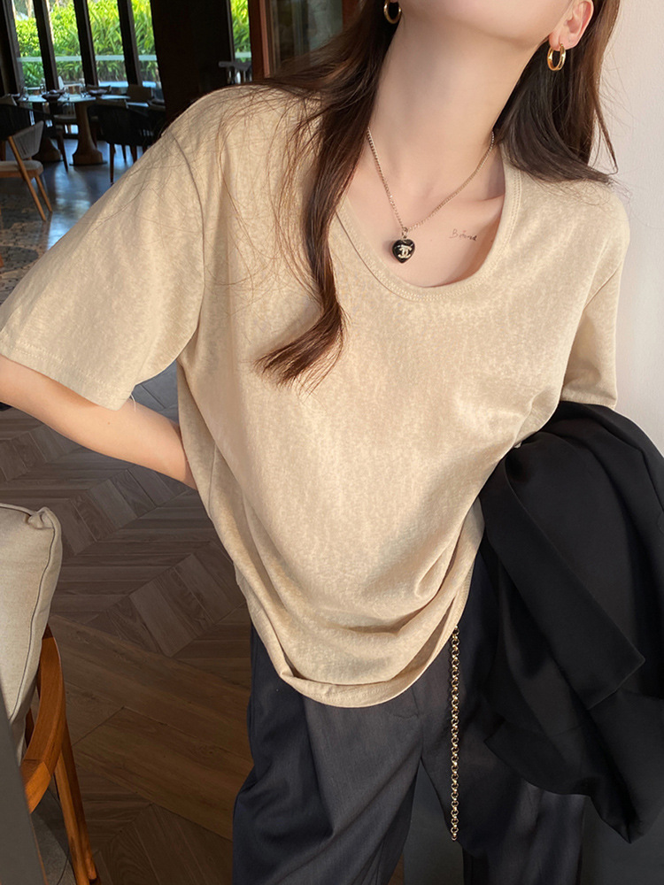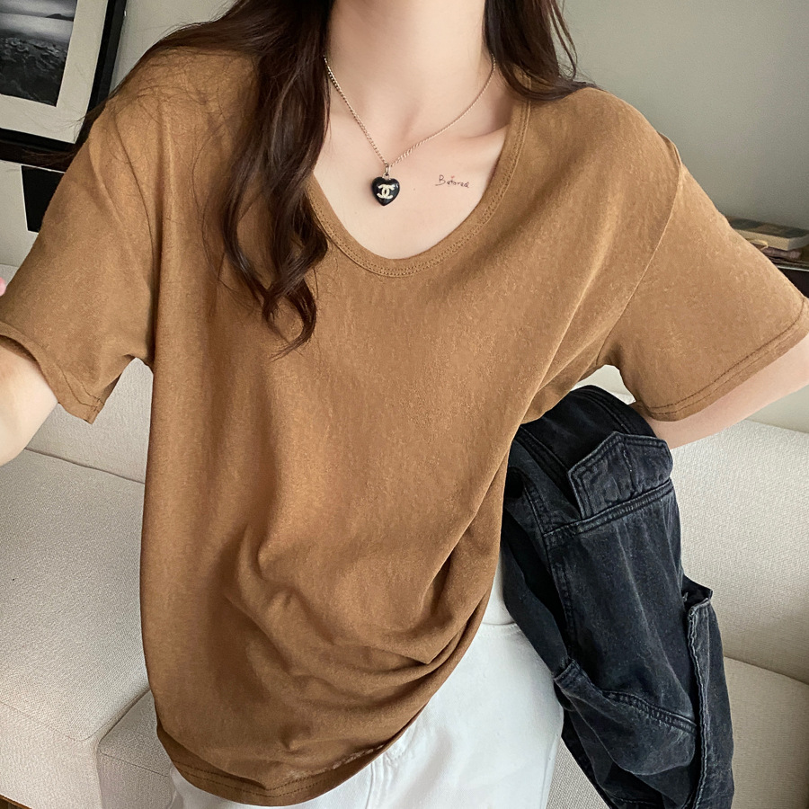 棉麻上衣女短袖夏季薄款年新款竹节棉v领t恤白色半袖纯色冰丝