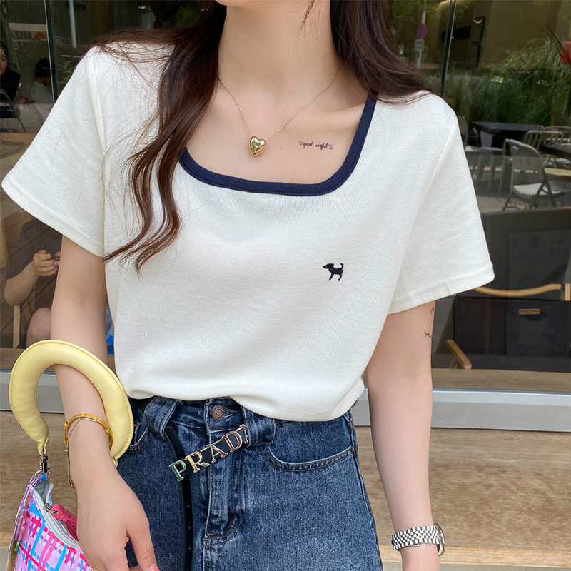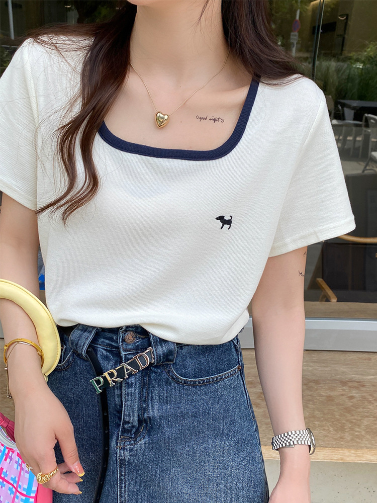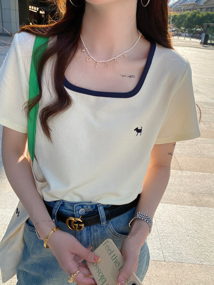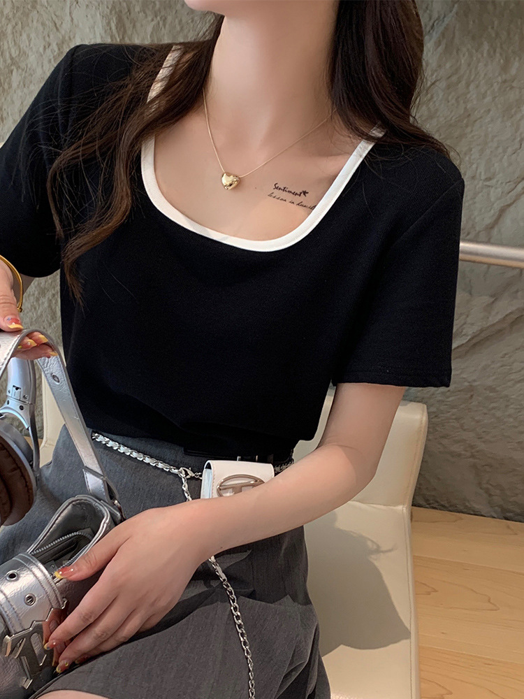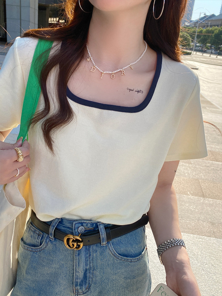 方领正肩短袖T恤女夏季打底衫纯色短款半袖显瘦纯棉上衣新款
