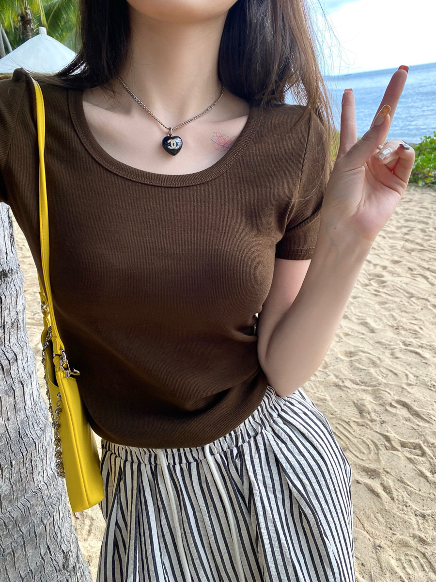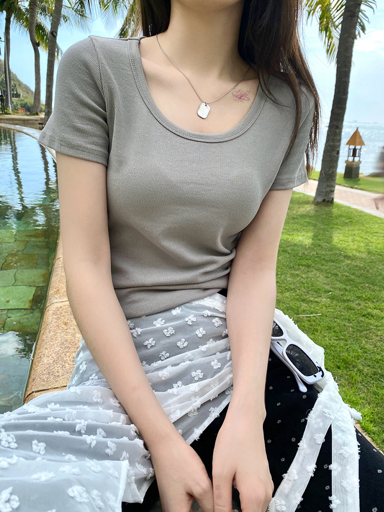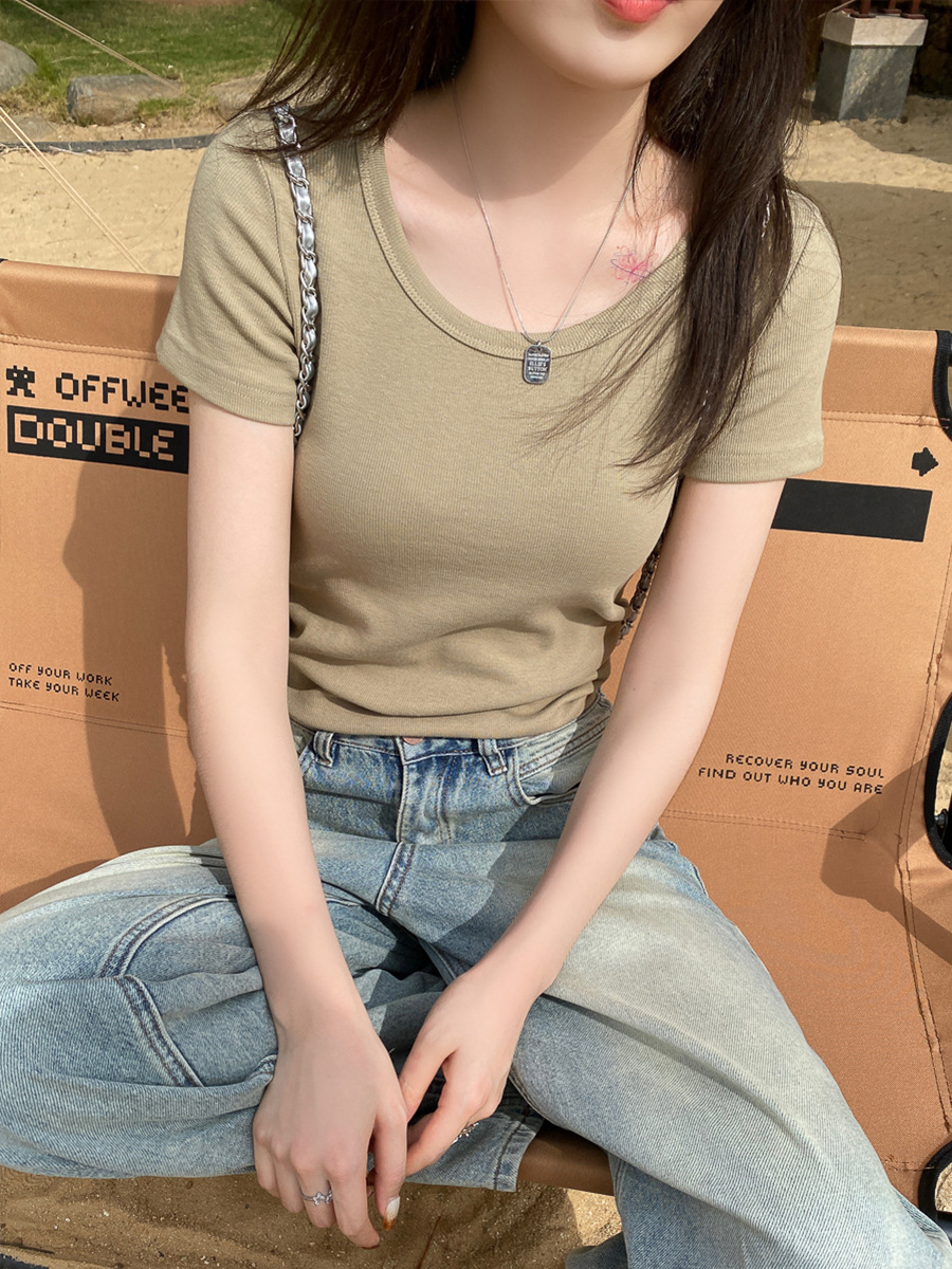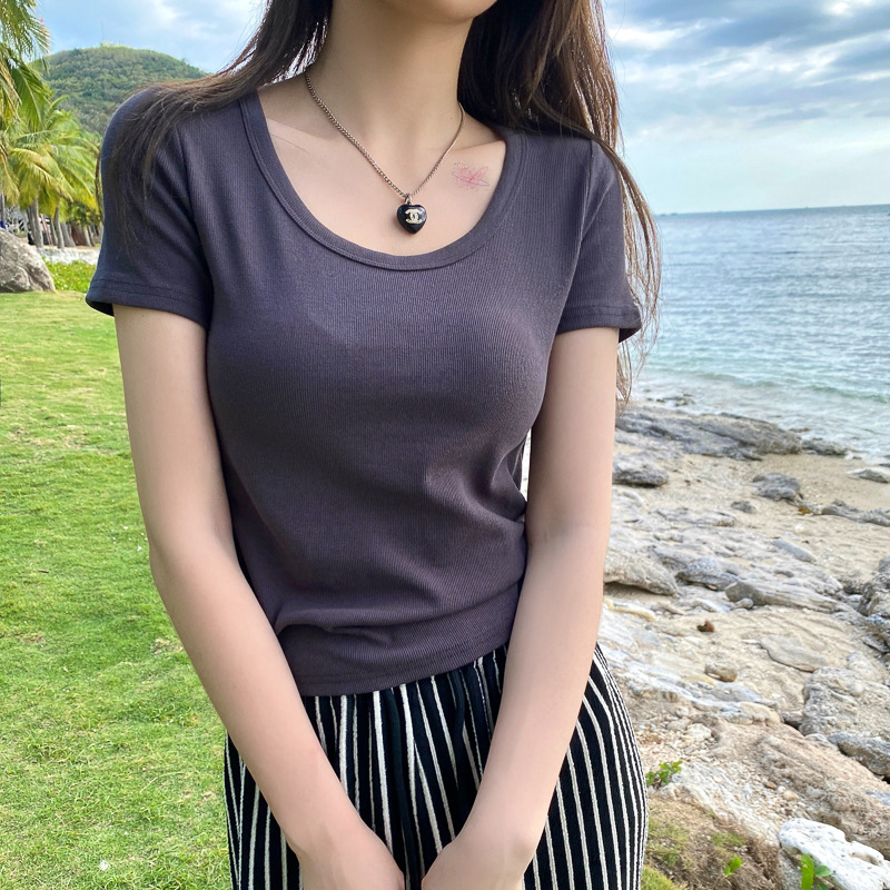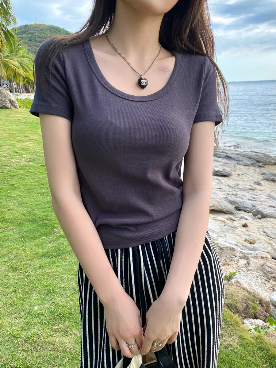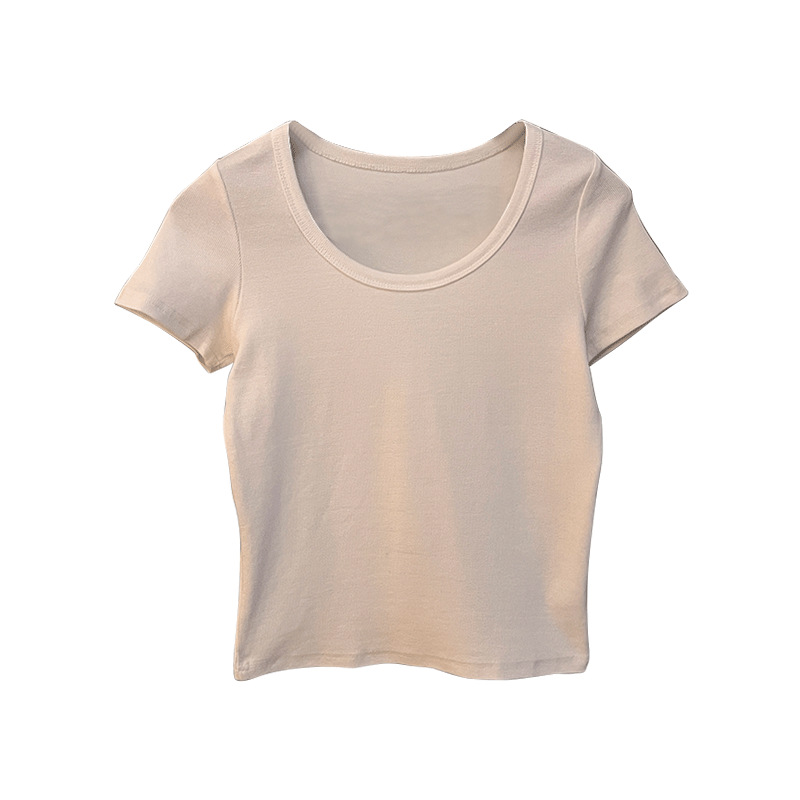 正肩短袖t恤女夏季年新款纯色圆领半袖体恤修身辣妹短款上衣