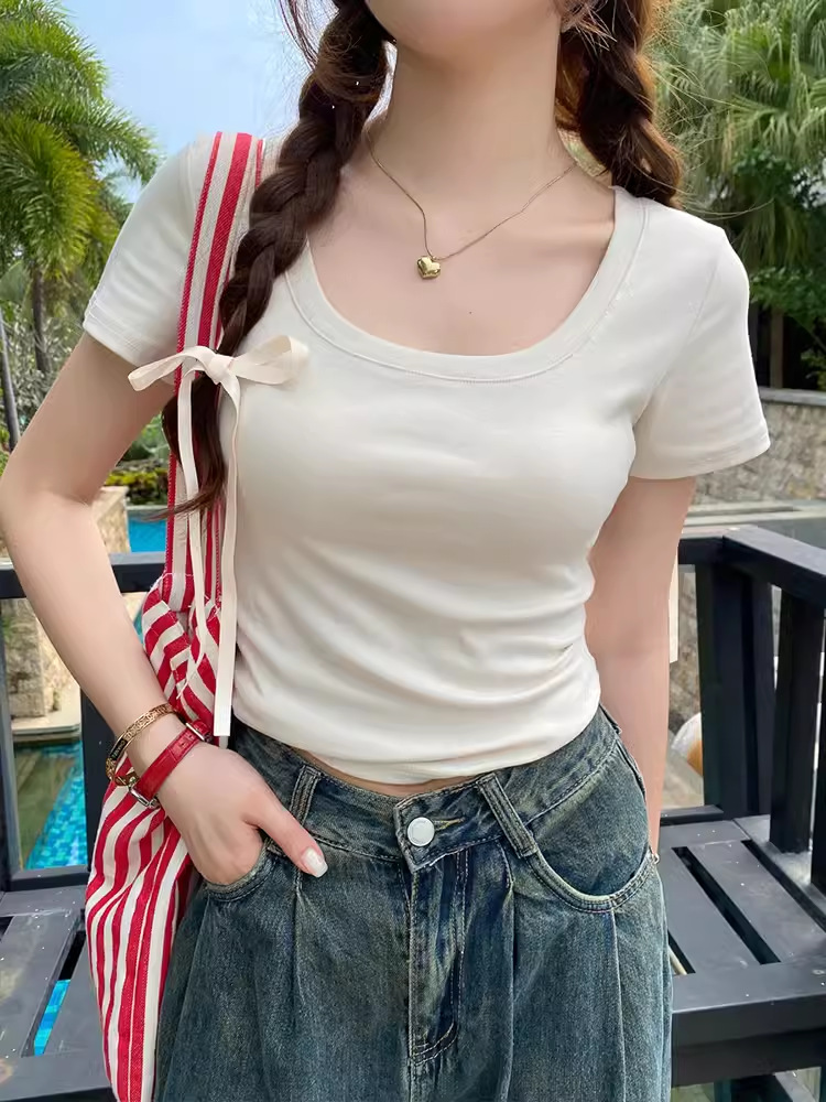 夏新款多巴胺浅蓝圆领正肩短款飞飞袖T恤褶皱收腰显瘦上衣女