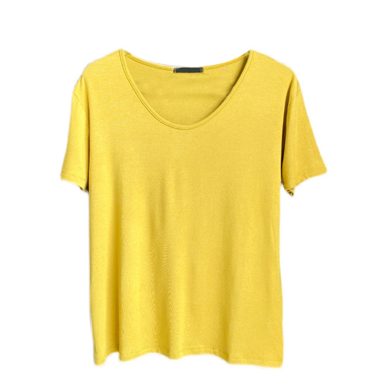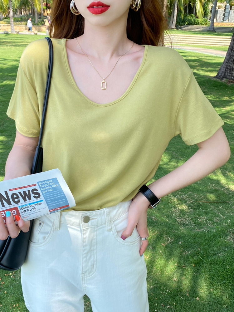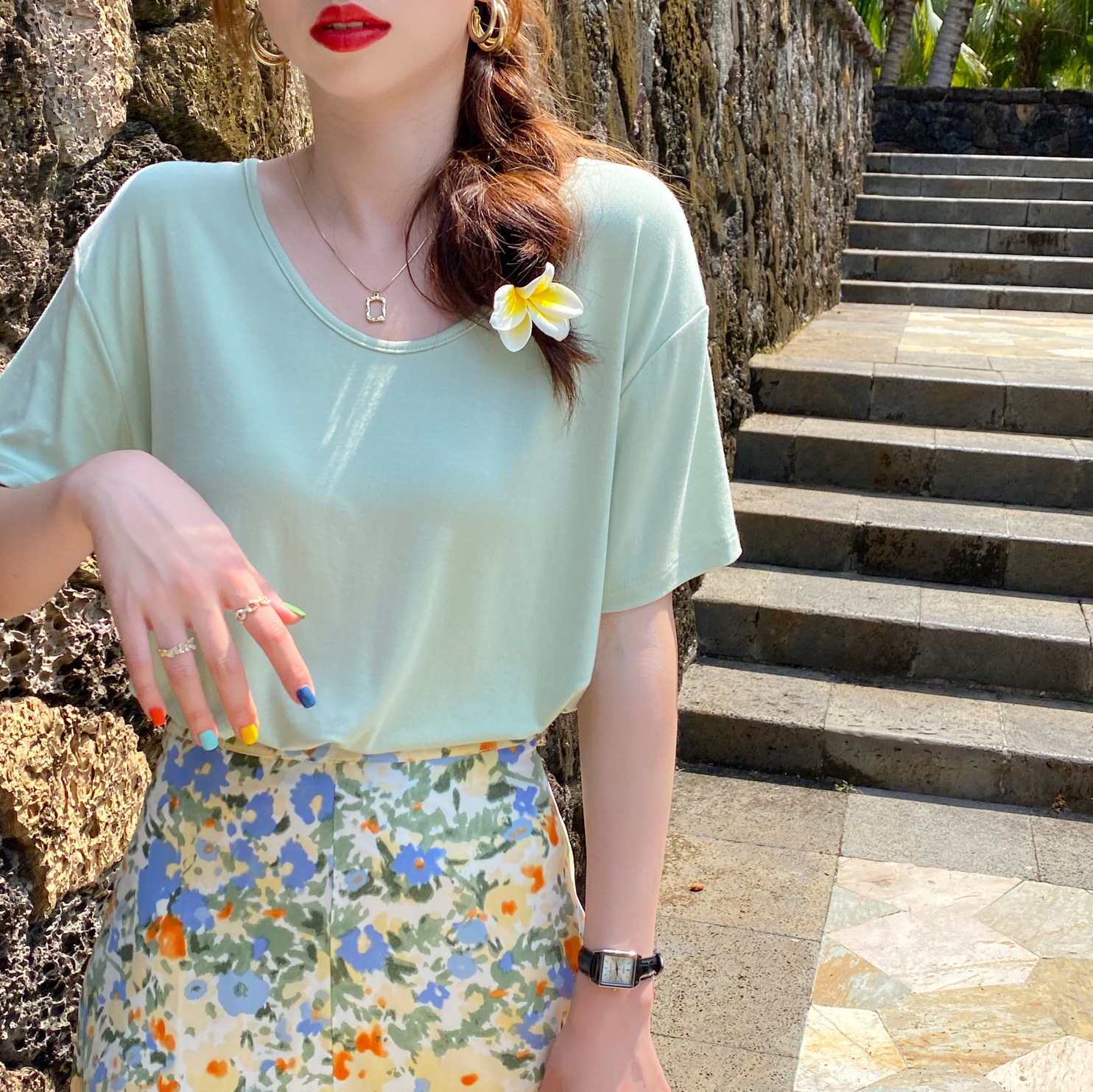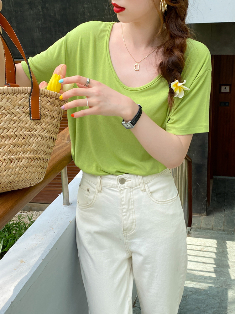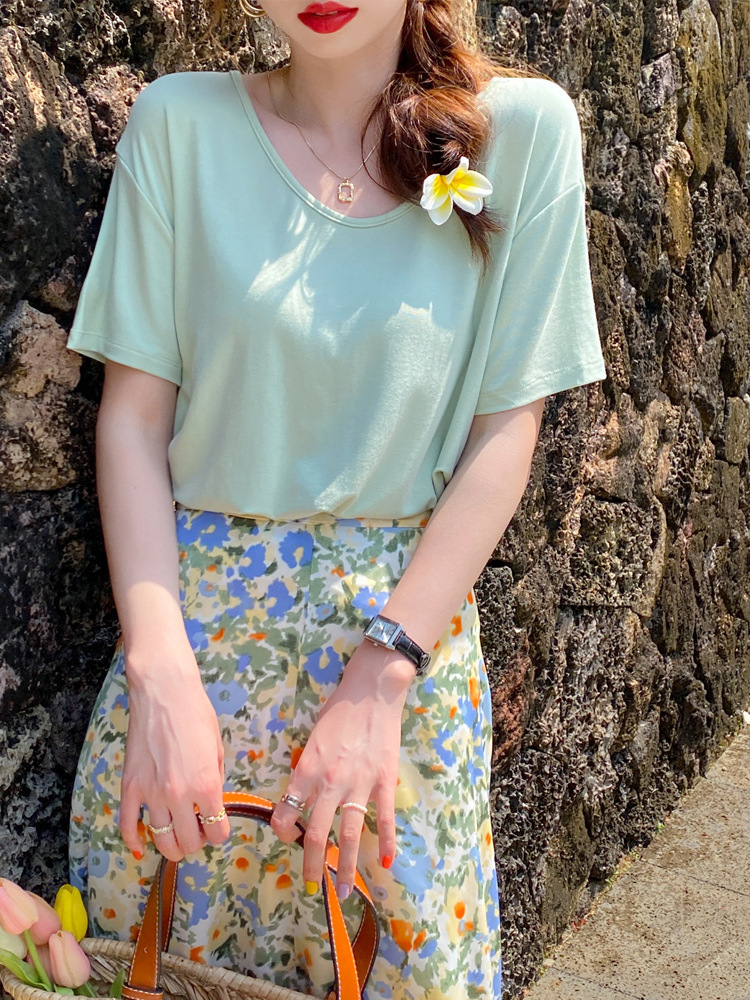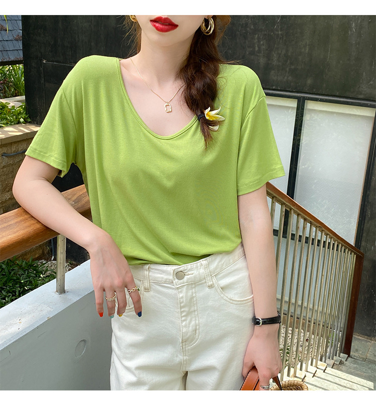 莫代尔棉短袖面膜t恤女年新款V领体恤冰丝上衣夏季绿色半袖
