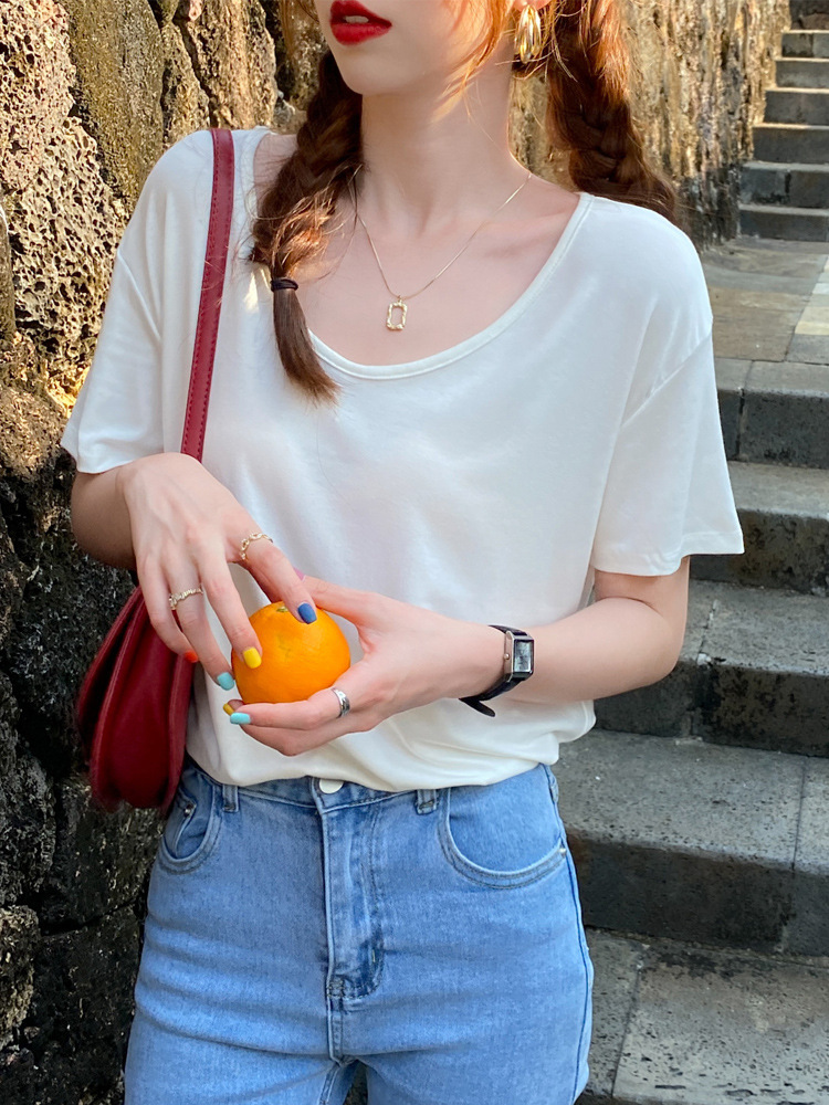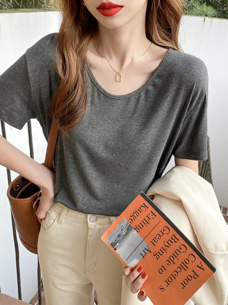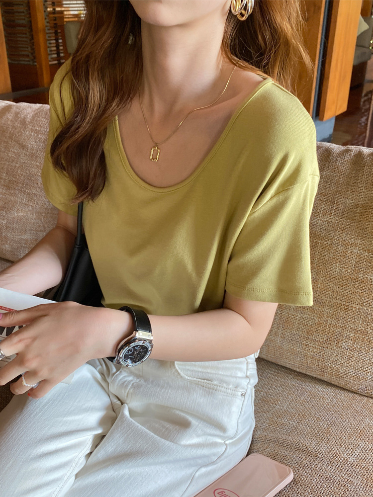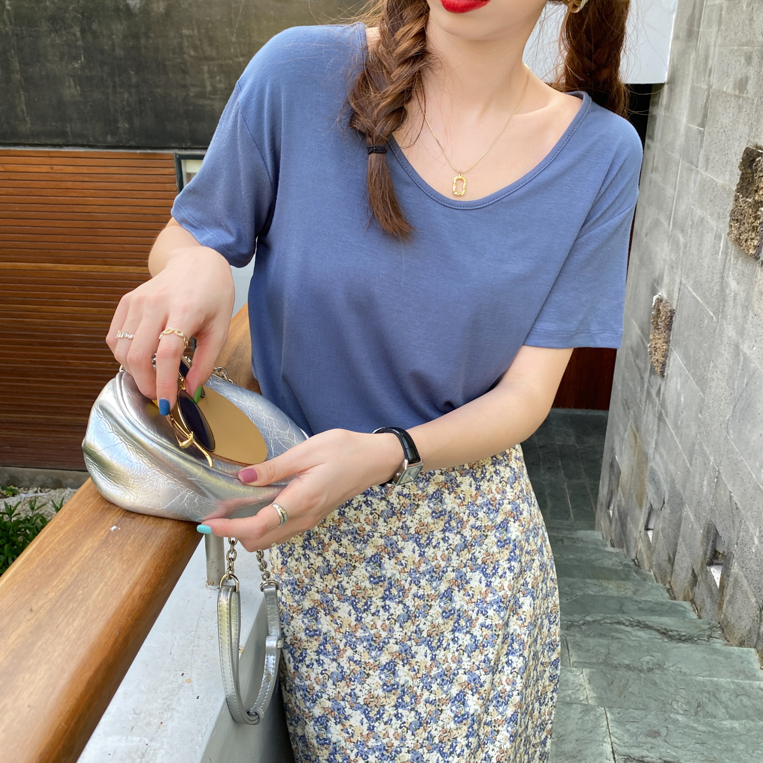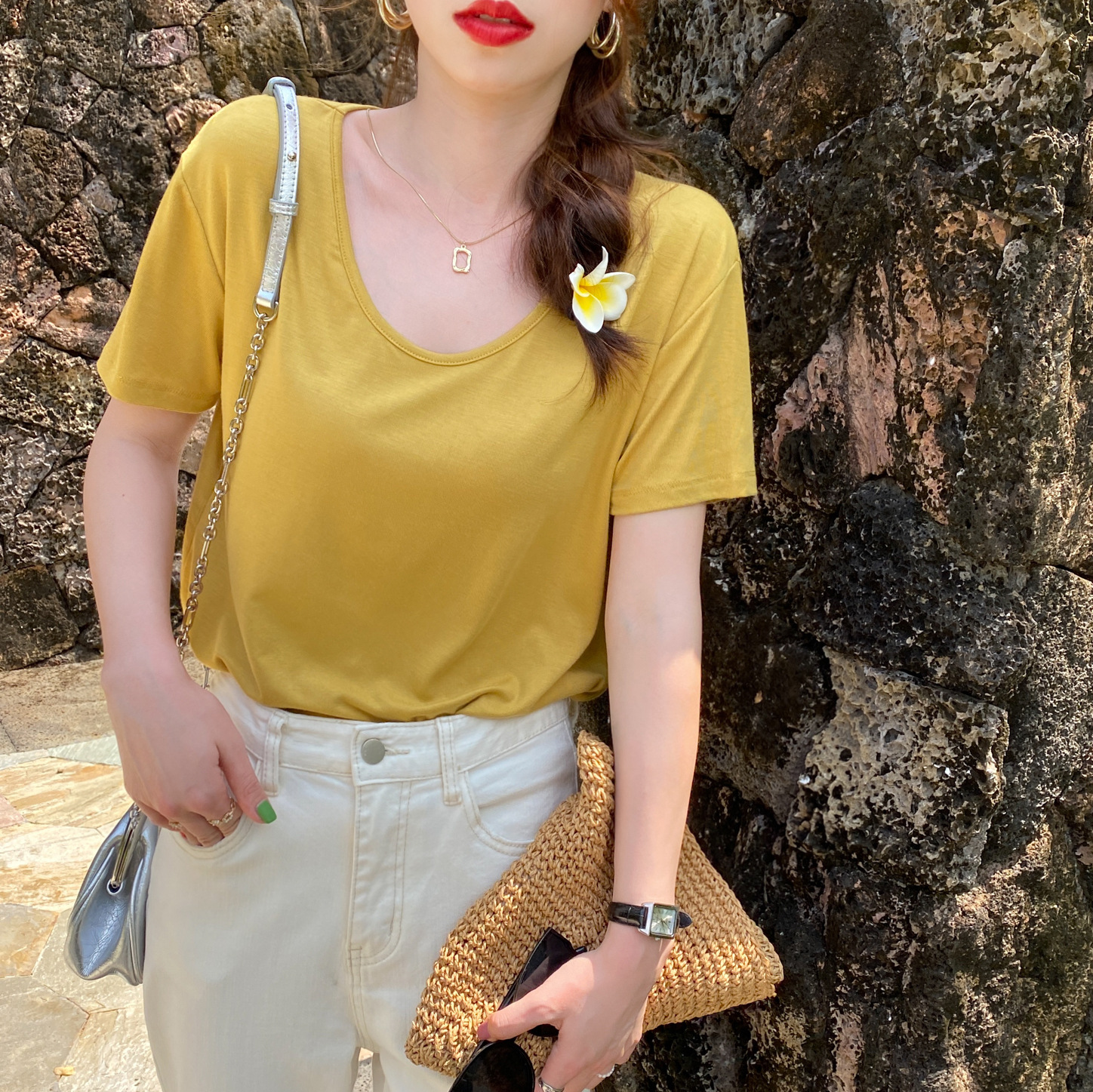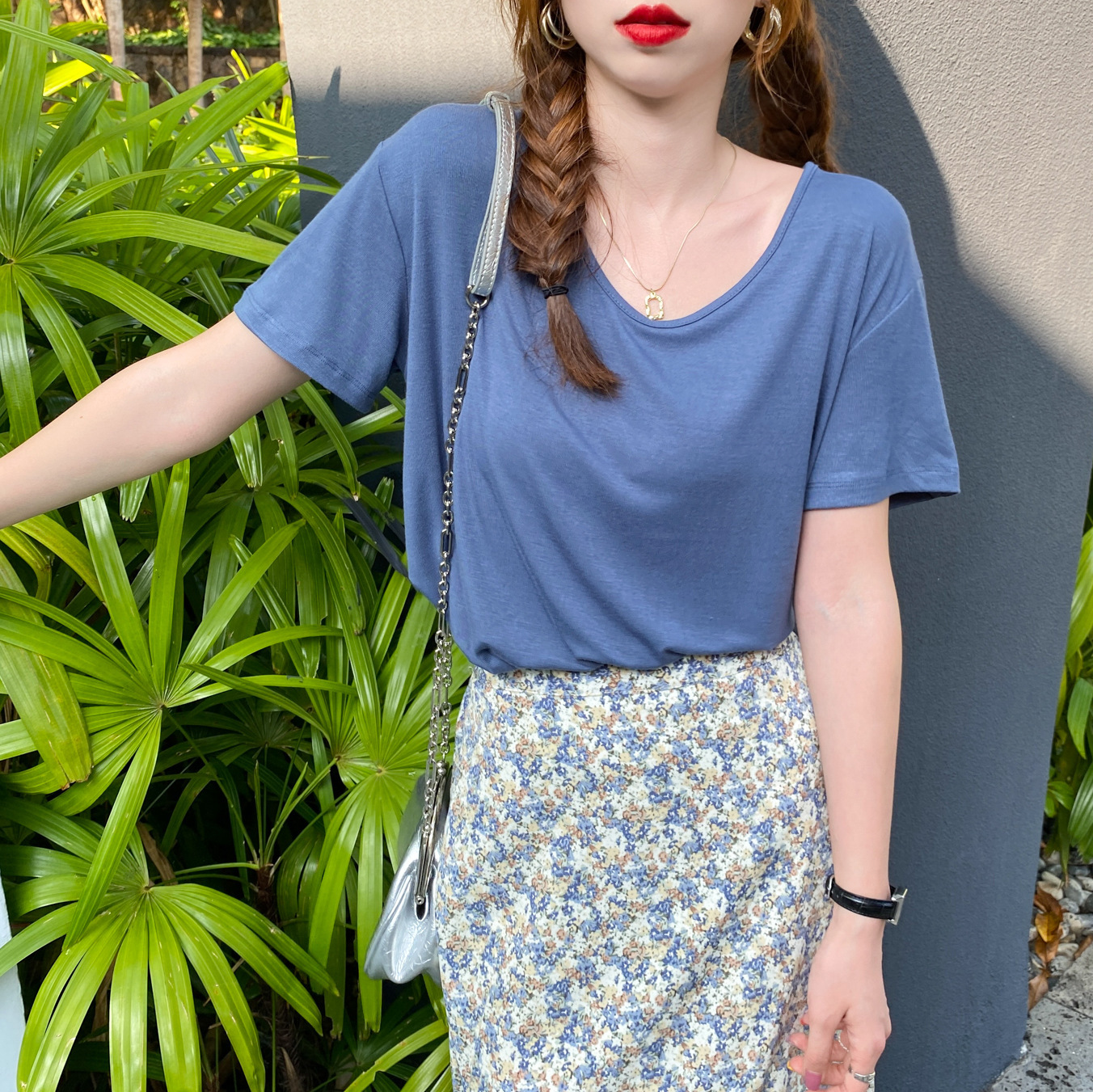 莫代尔棉短袖面膜t恤女年新款V领体恤冰丝上衣夏季绿色半袖