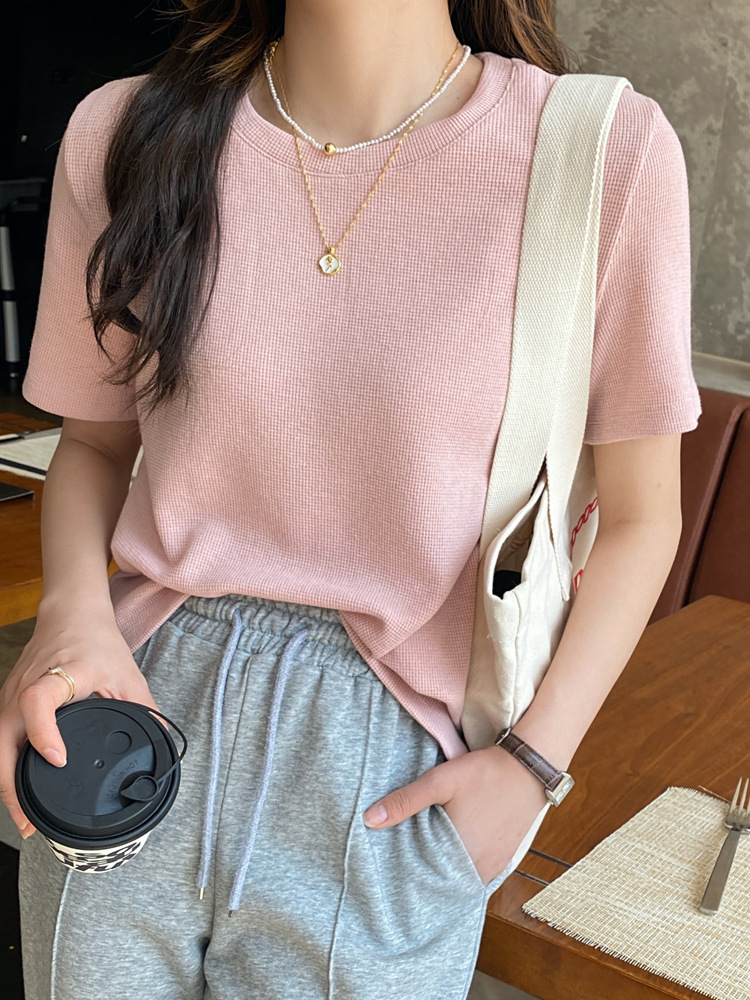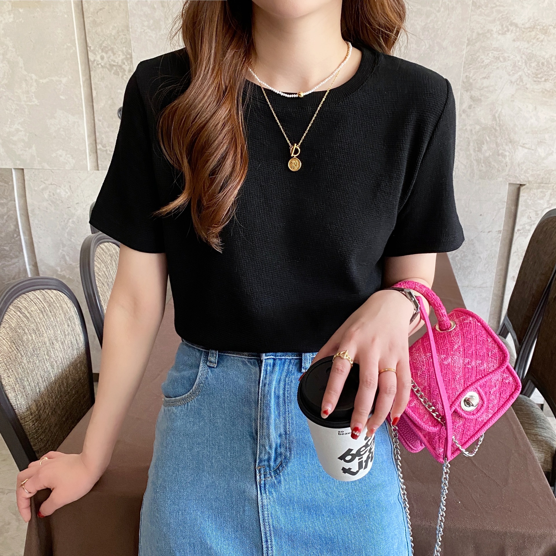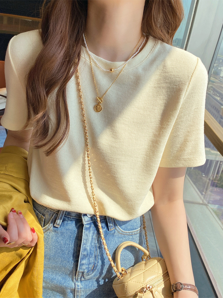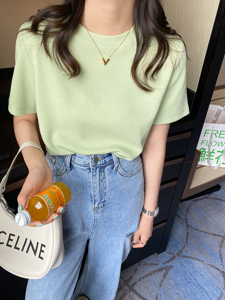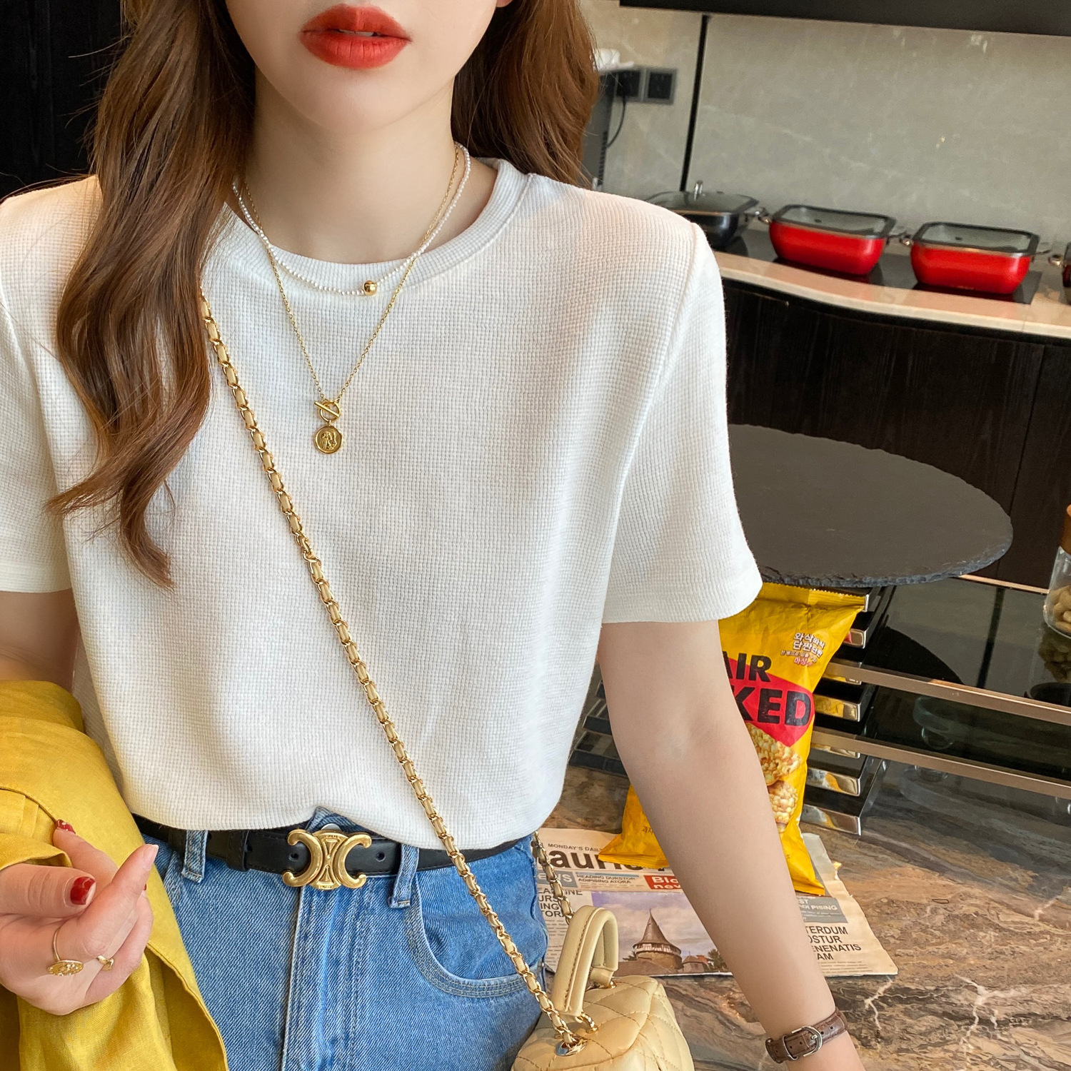 短袖女夏季年新款圆领华夫格纯色t恤ins宽松半袖上衣白色体恤