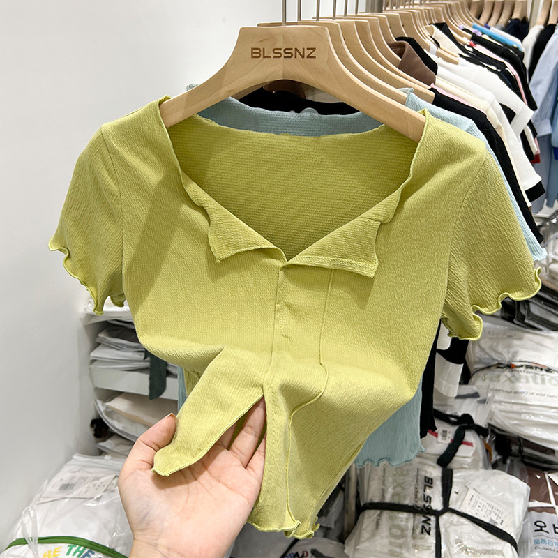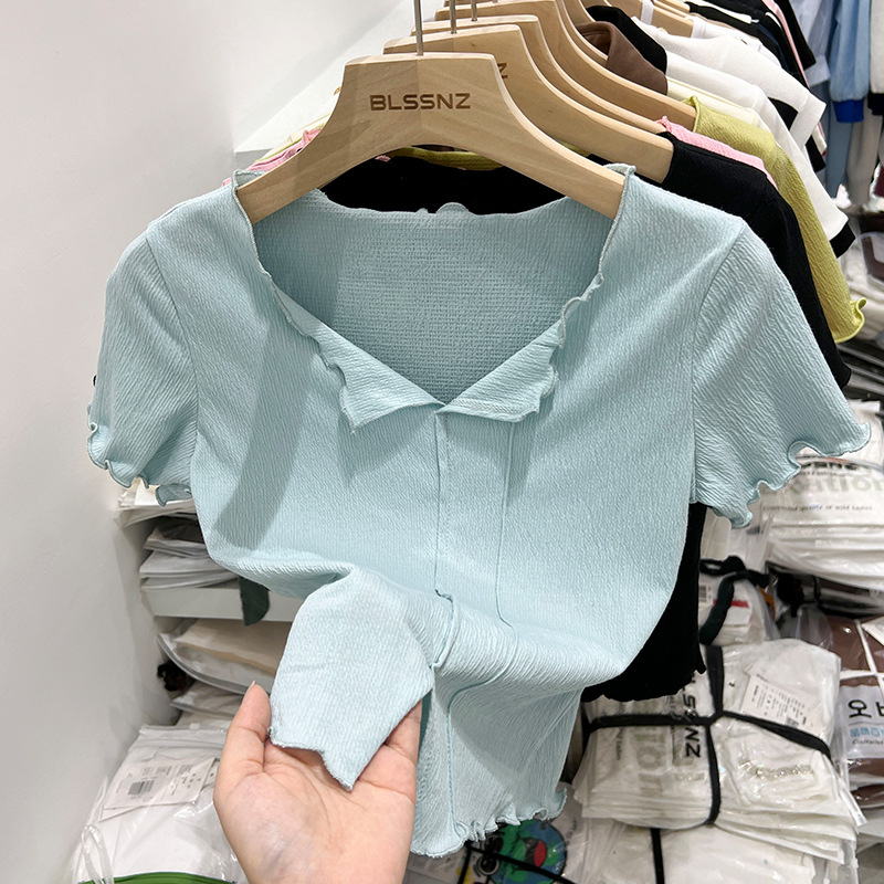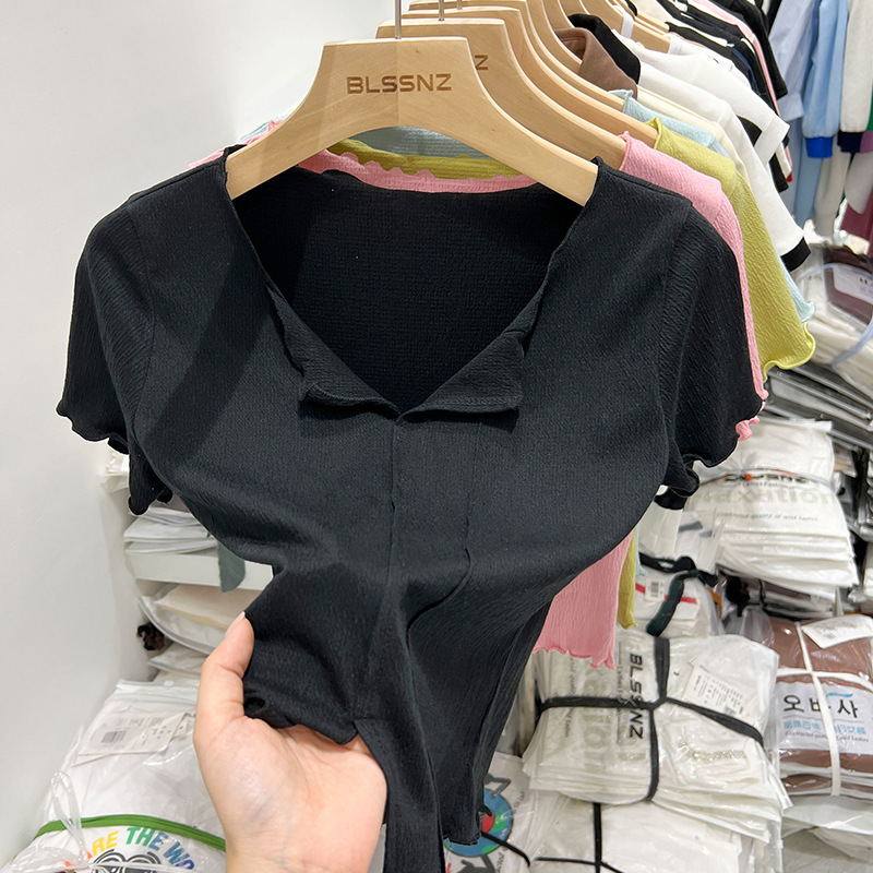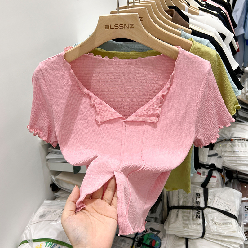 V领刺绣短款ins潮上衣甜妹短袖t恤女夏季修身百搭显瘦上衣