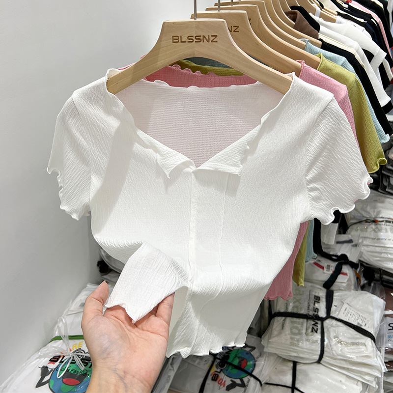 v领白色短袖t恤女设计感小众夏季新款修身独特别致短款上衣女