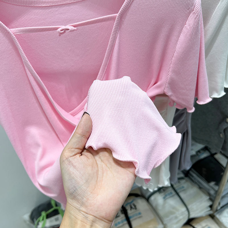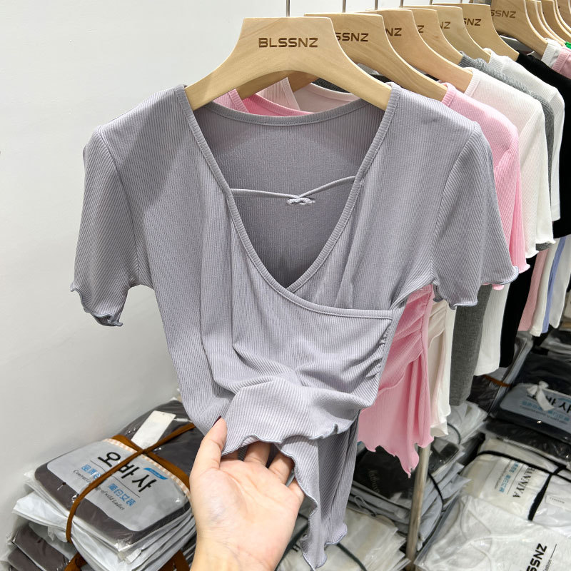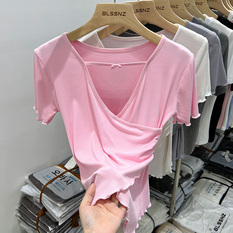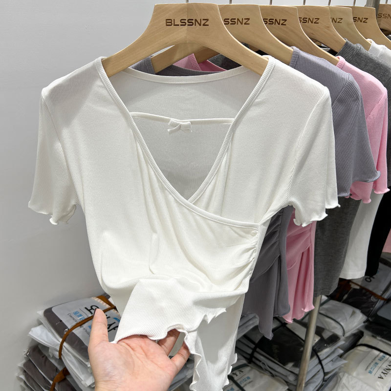 欧货白色v领短袖t恤女设计感小众夏季别致甜辣不规则锁骨短款上衣