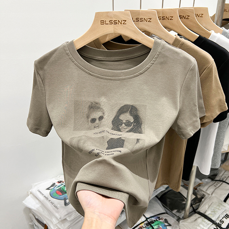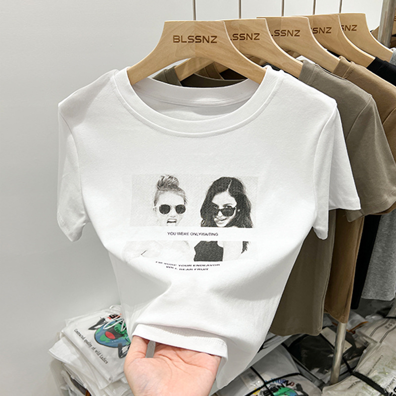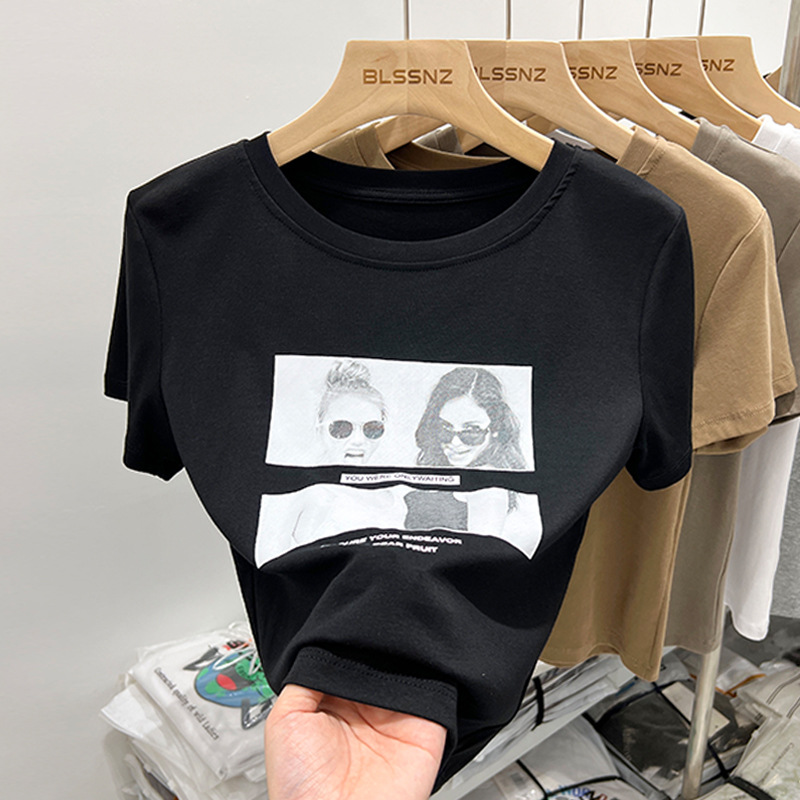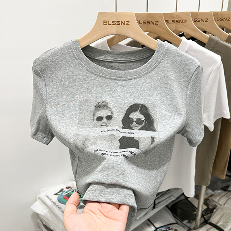 欧货美式复古正肩短袖t恤女夏季新款别致印花短款上衣体恤潮