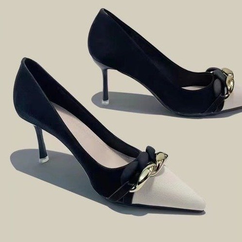 气质名媛小香风细跟高跟鞋女新款尖头拼色法式通勤工作女鞋