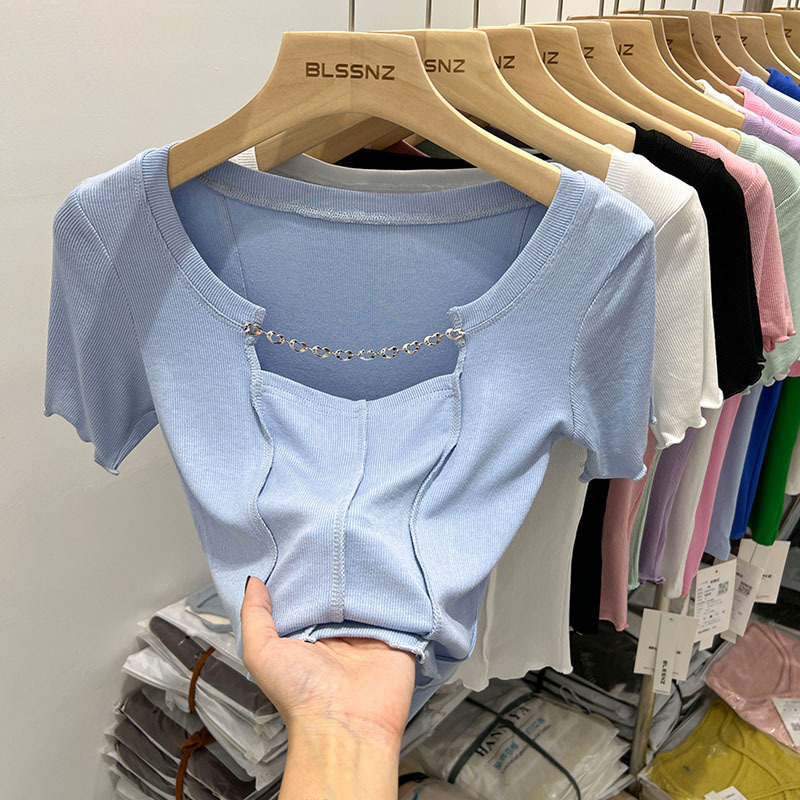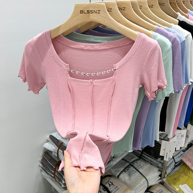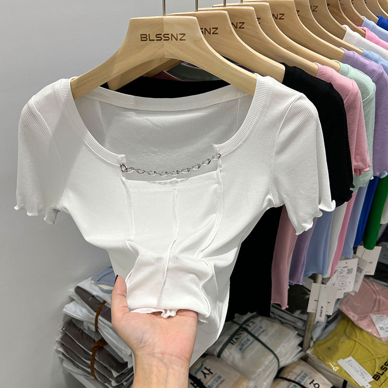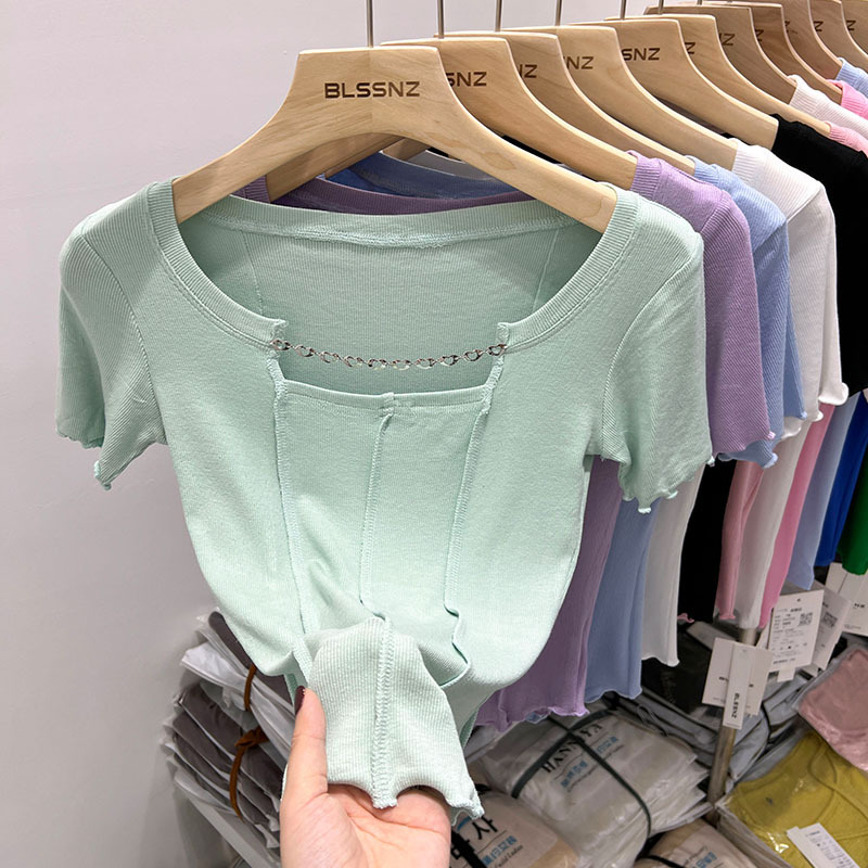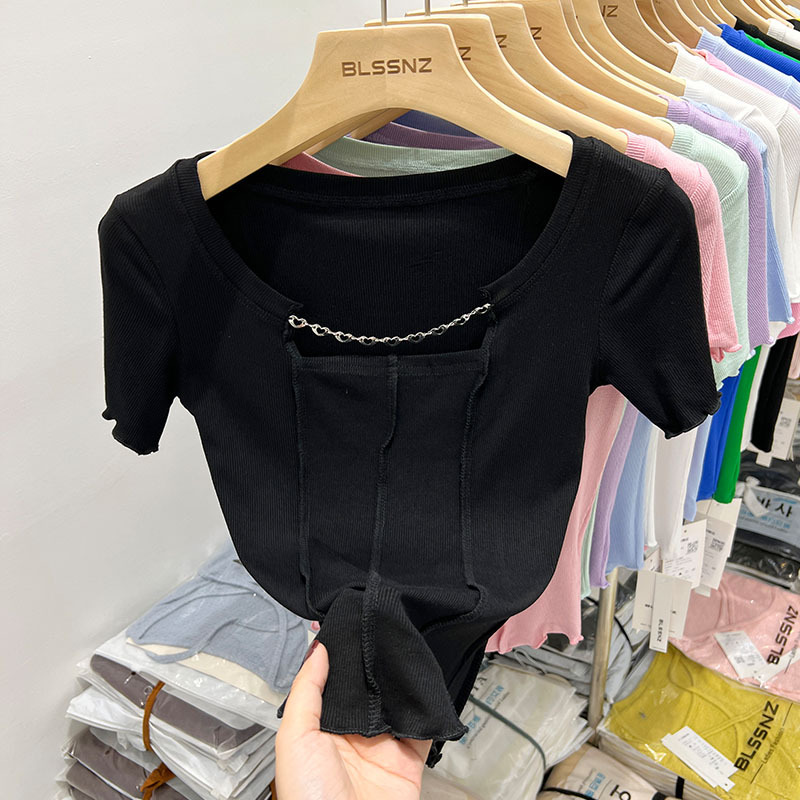 正肩短袖t恤女ins潮夏季新款别致镂空短款方领上衣设计感小众