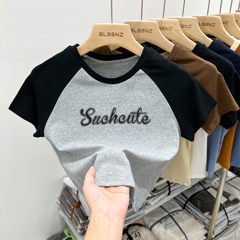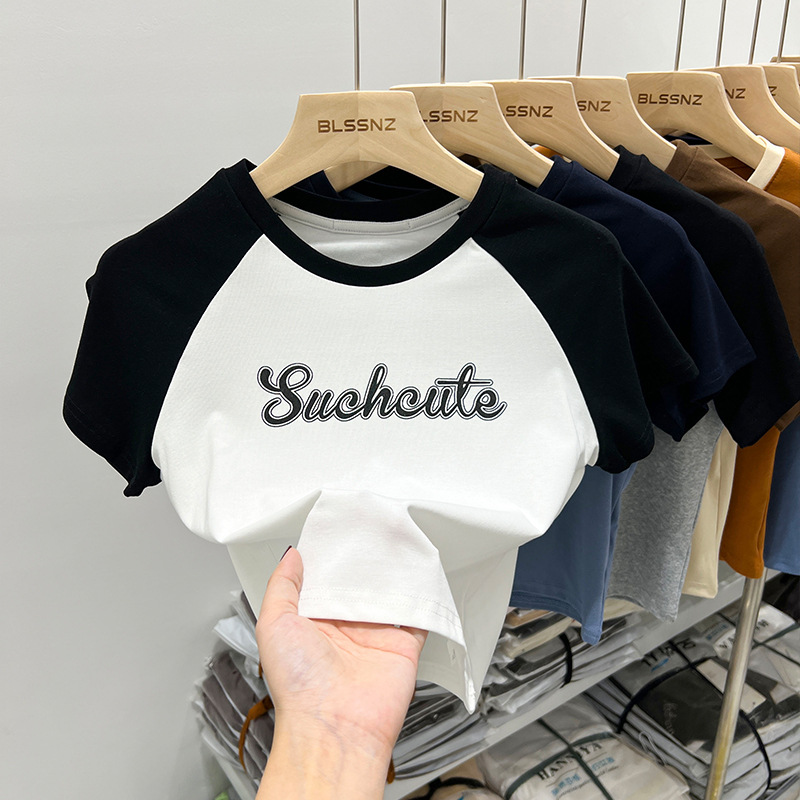 美式复古短袖t恤女纯棉夏季新款印花插肩别致短款上衣体恤潮