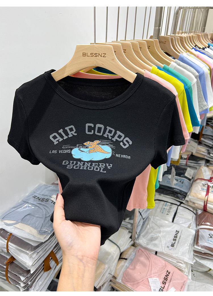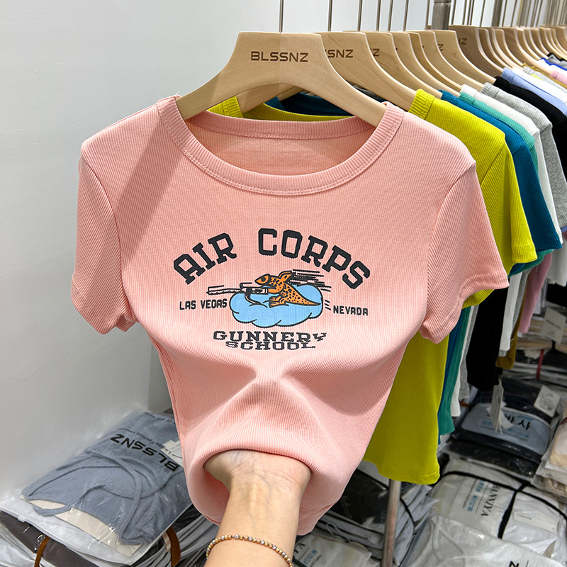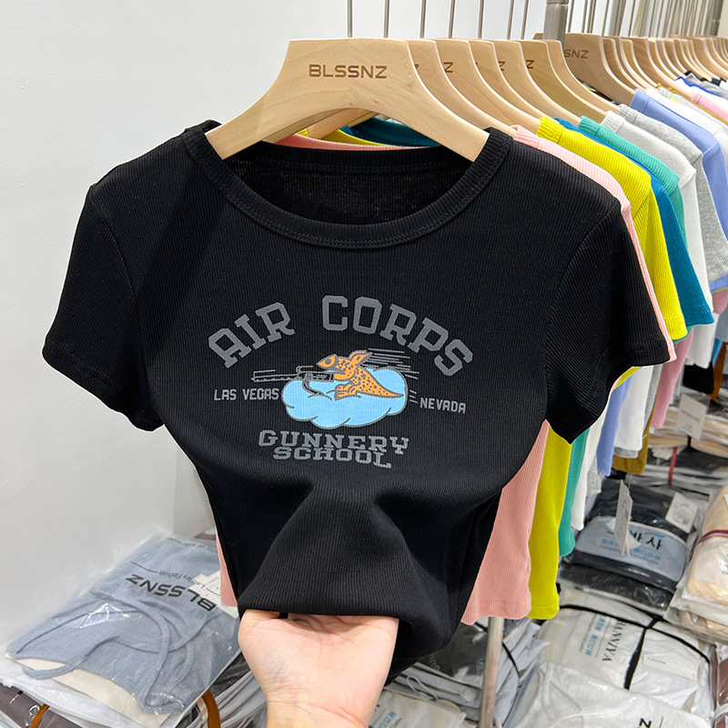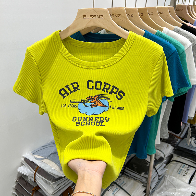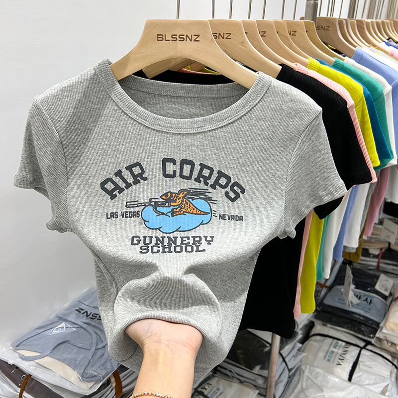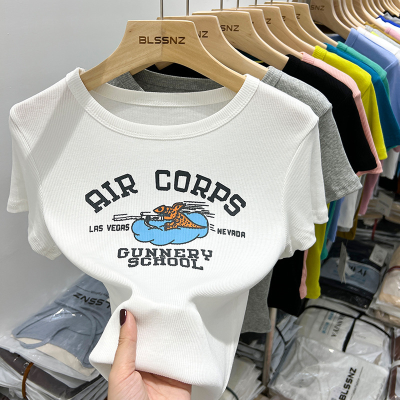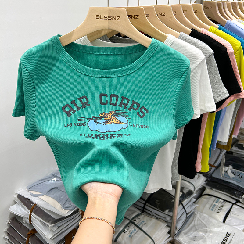 欧货纯棉短袖t恤女正肩夏季新款洋气印花短款上衣半袖体恤女