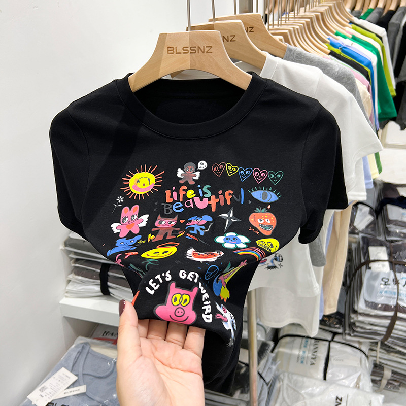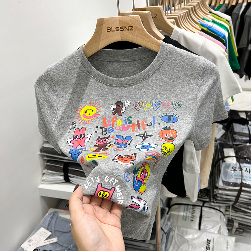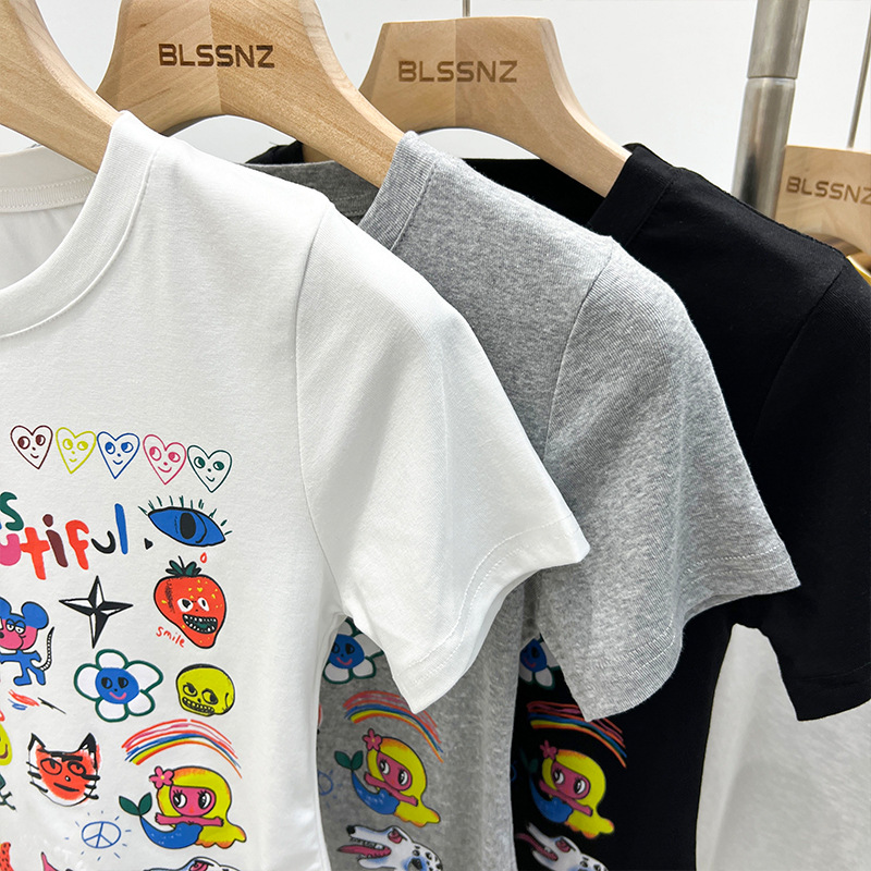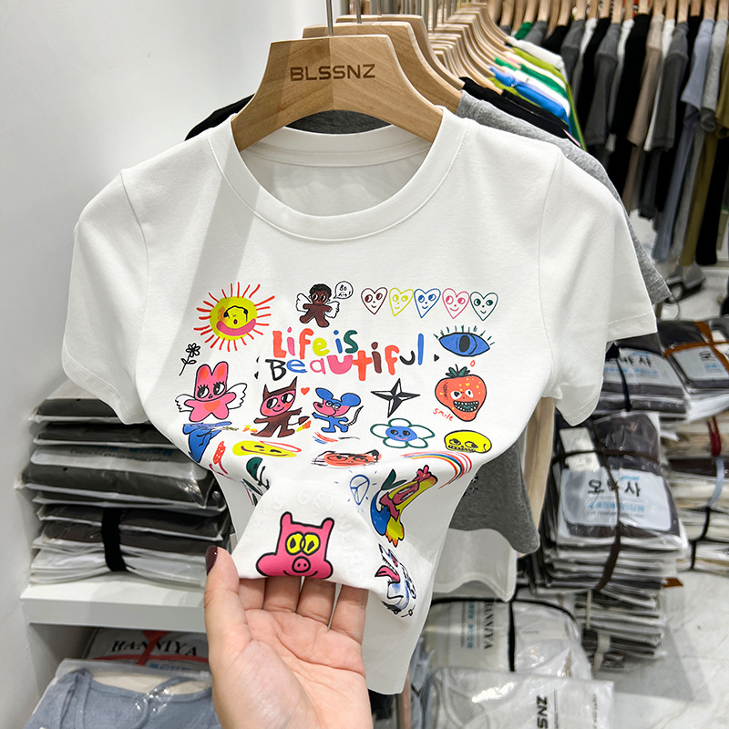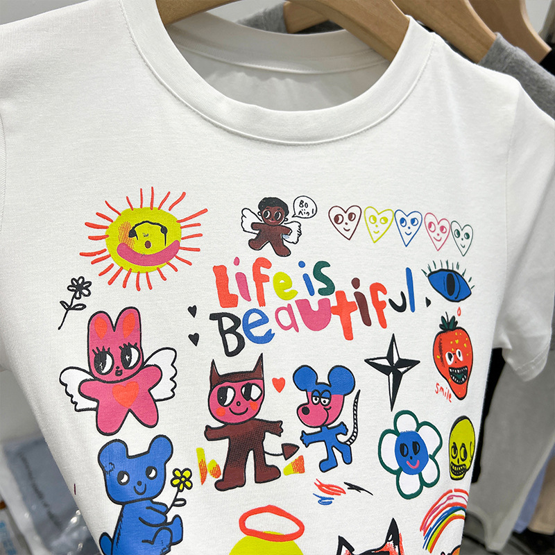 白色印花短袖t恤女夏季新款洋气独特别致设计感小众短款上衣