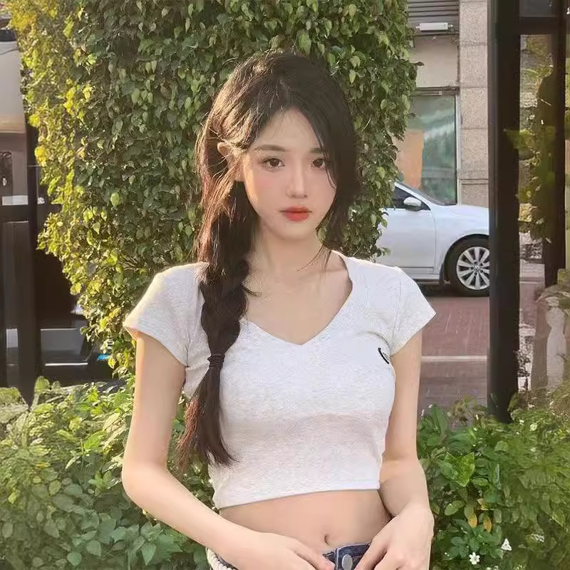 纯欲风莫代尔V领夏季辣妹上衣修身显瘦短款设计感女露脐短袖t