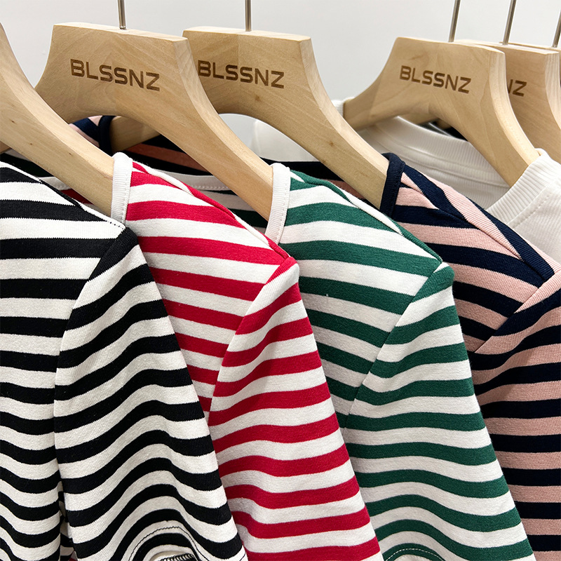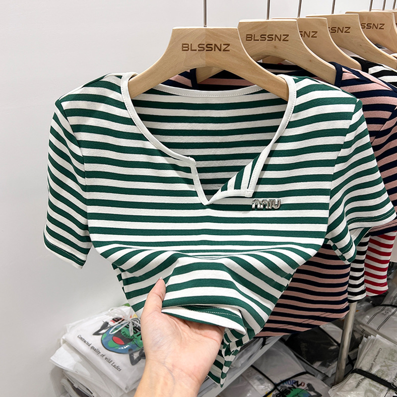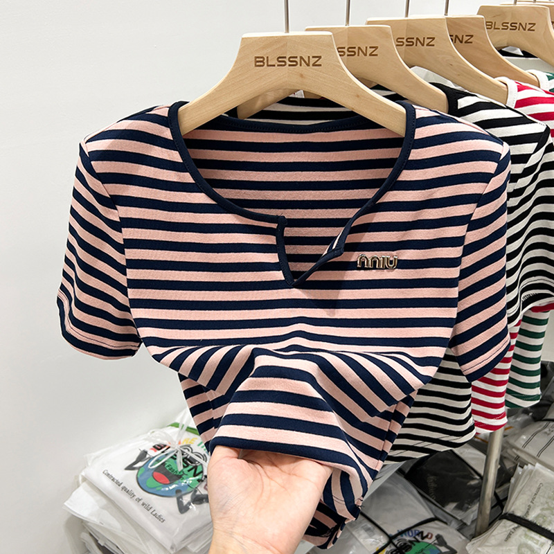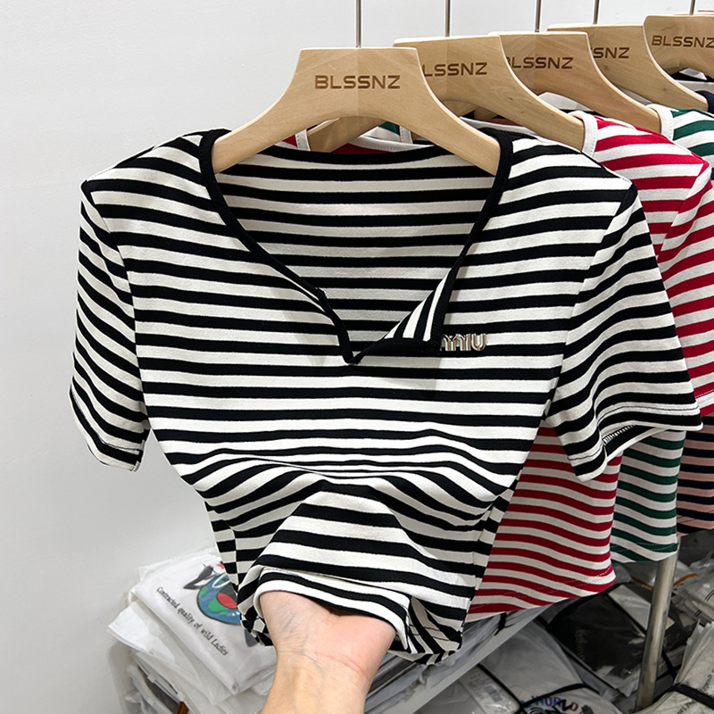 v领条纹正肩短袖t恤女设计感小众夏季洋气别致垫肩短款上衣体恤女