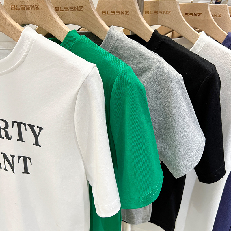 2025夏季新款蓝色纯棉短袖t恤女宽松百搭正肩小个子洋气减龄上衣
