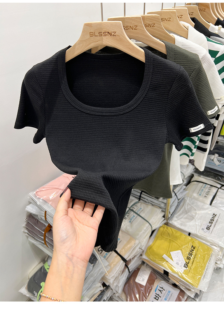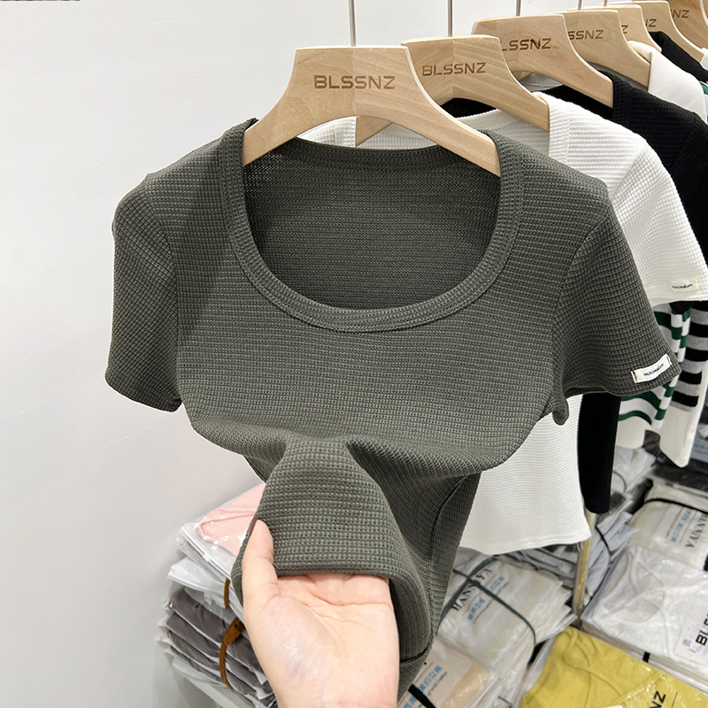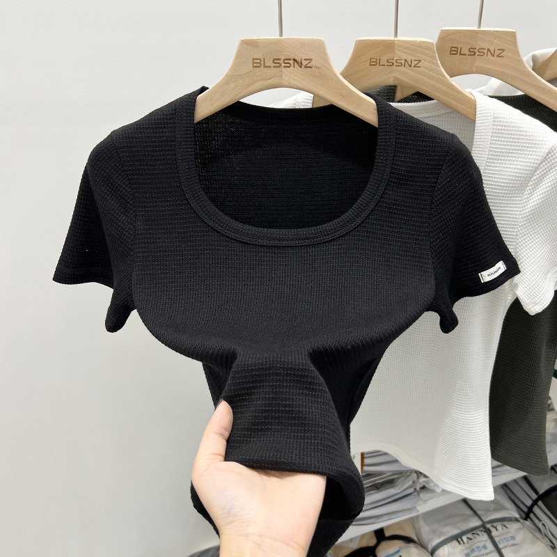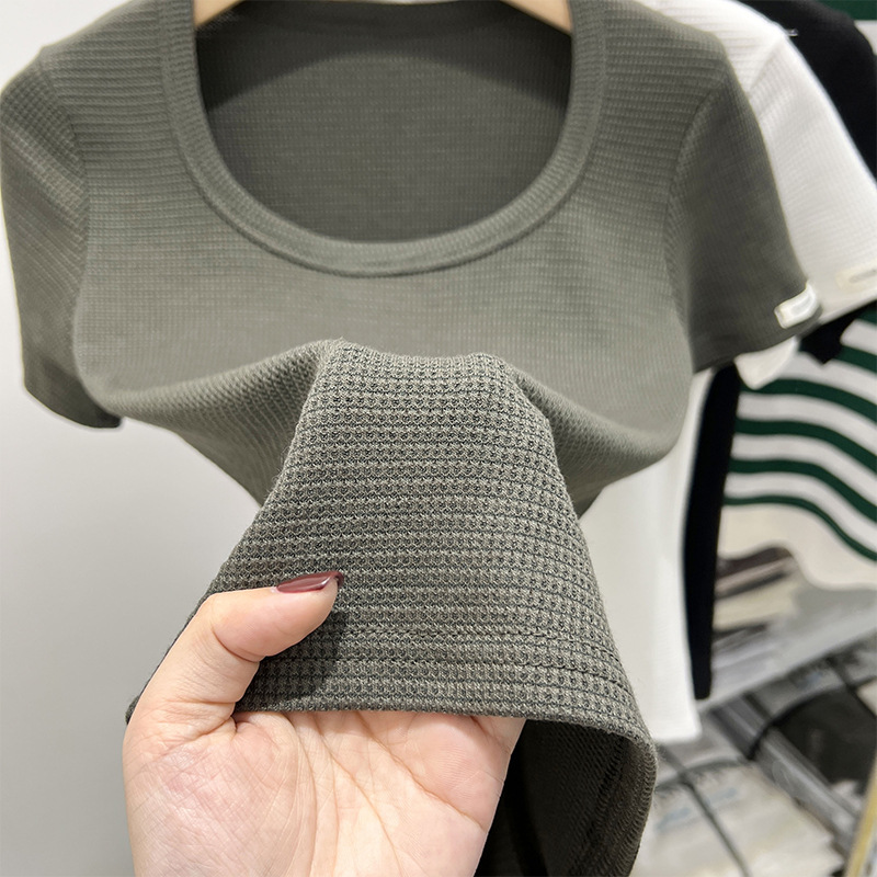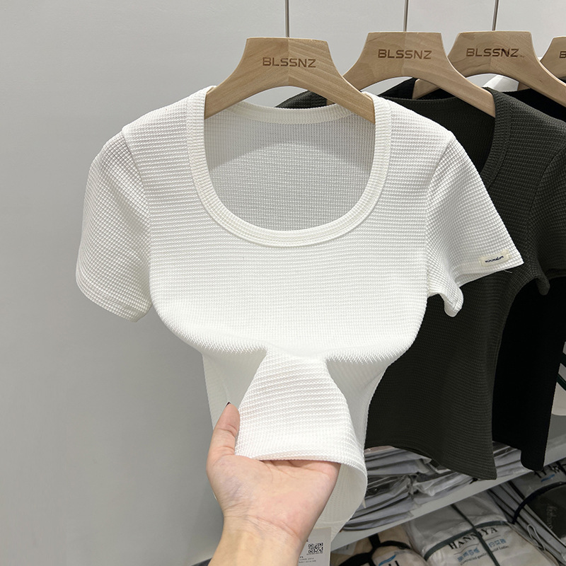 白色短袖t恤女夏季新款洋气华夫格小衫短款方领锁骨上衣体恤