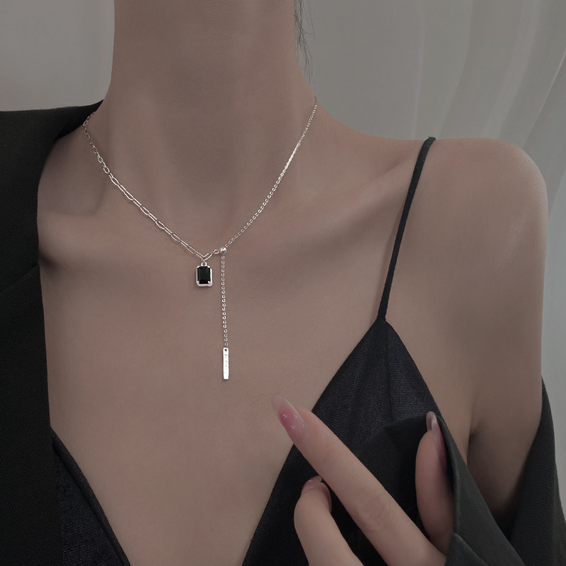 甜酷女孩黑钻方形流苏拼接抽拉锁骨链颈链轻奢酷字母黑色方牌项链