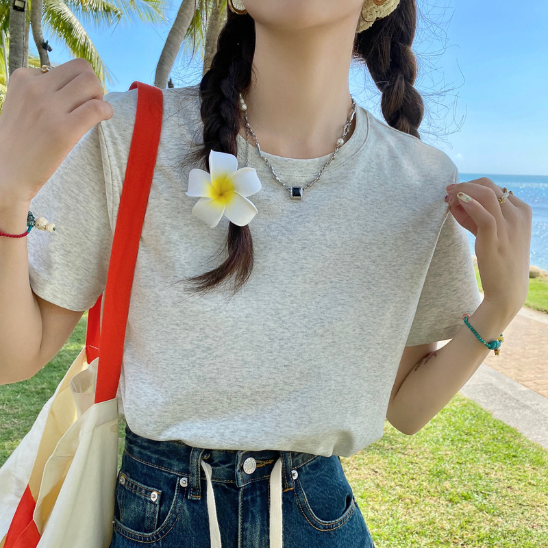 圆领短袖女t恤夏宽松新款灰色半袖体恤纯色纯棉正肩打底上衣