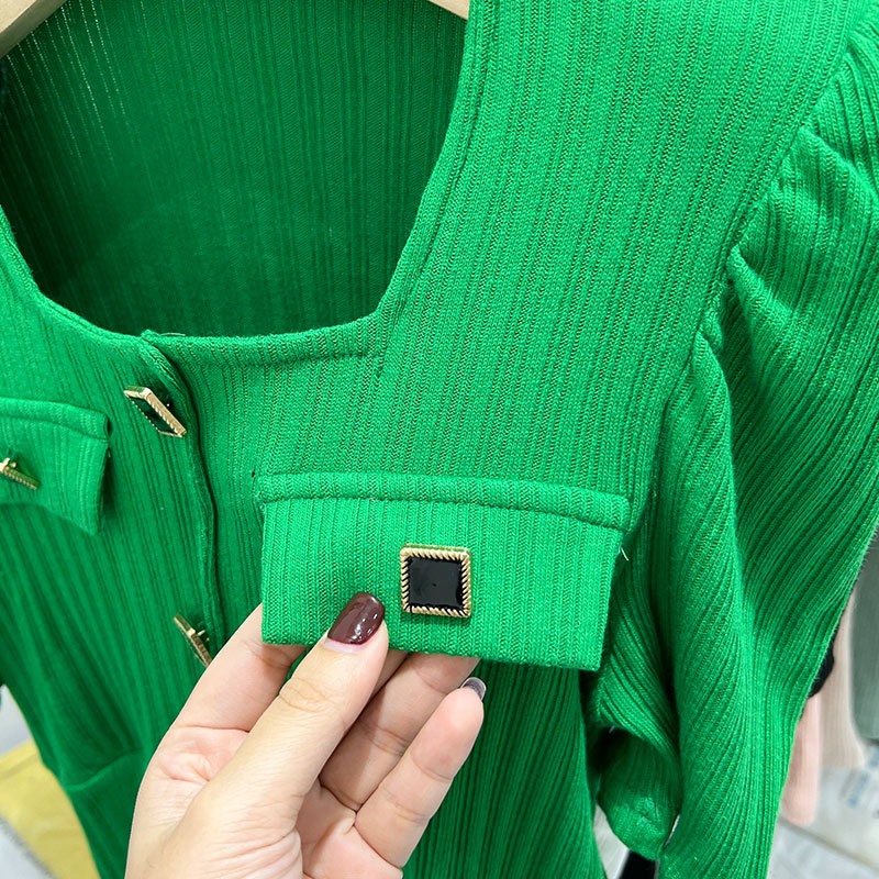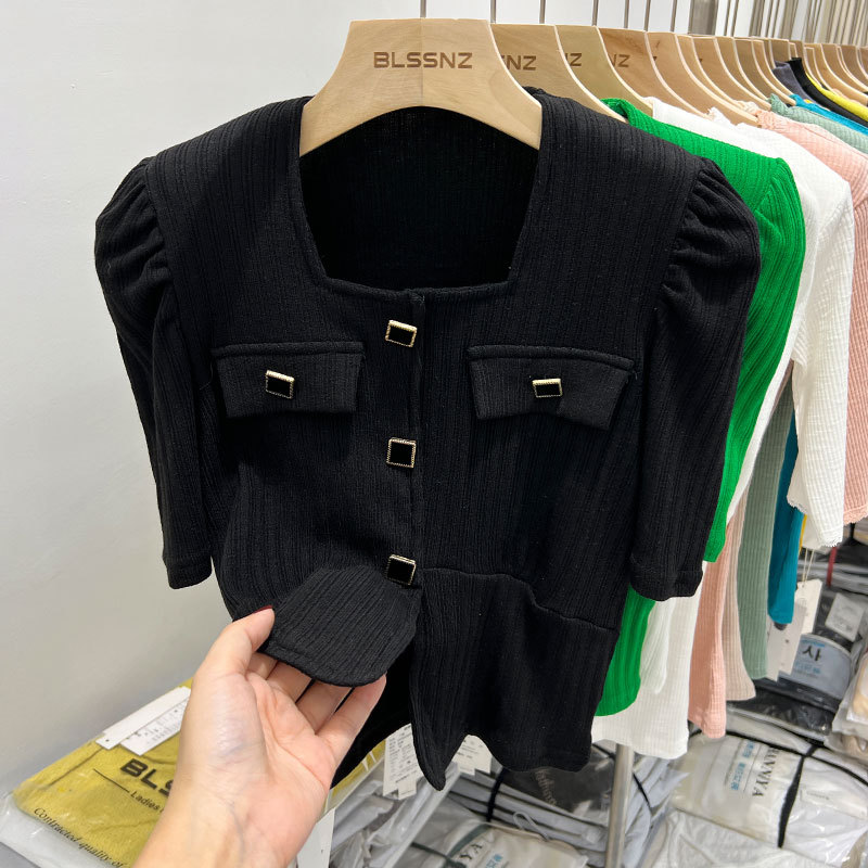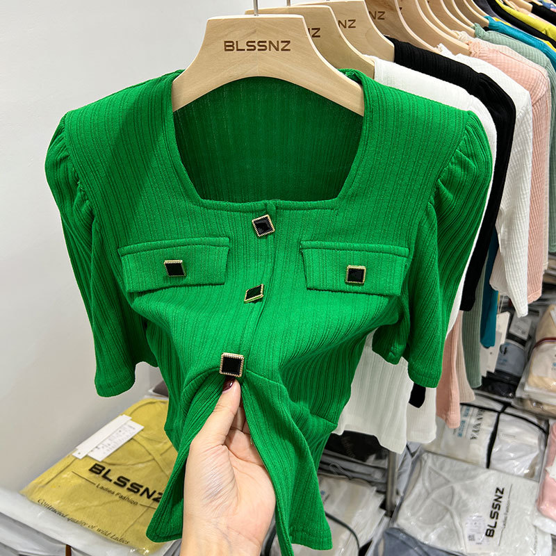 欧货螺纹短袖t恤女设计感小众夏季独特别致方领锁骨垫肩上衣体恤