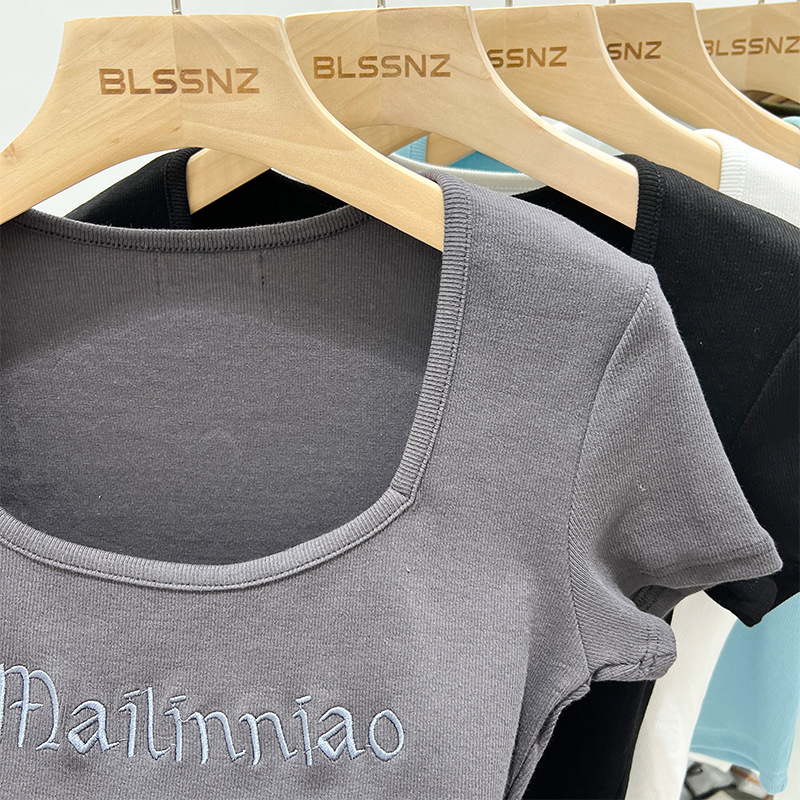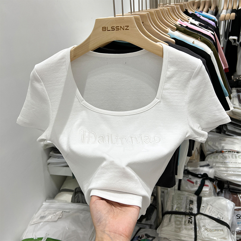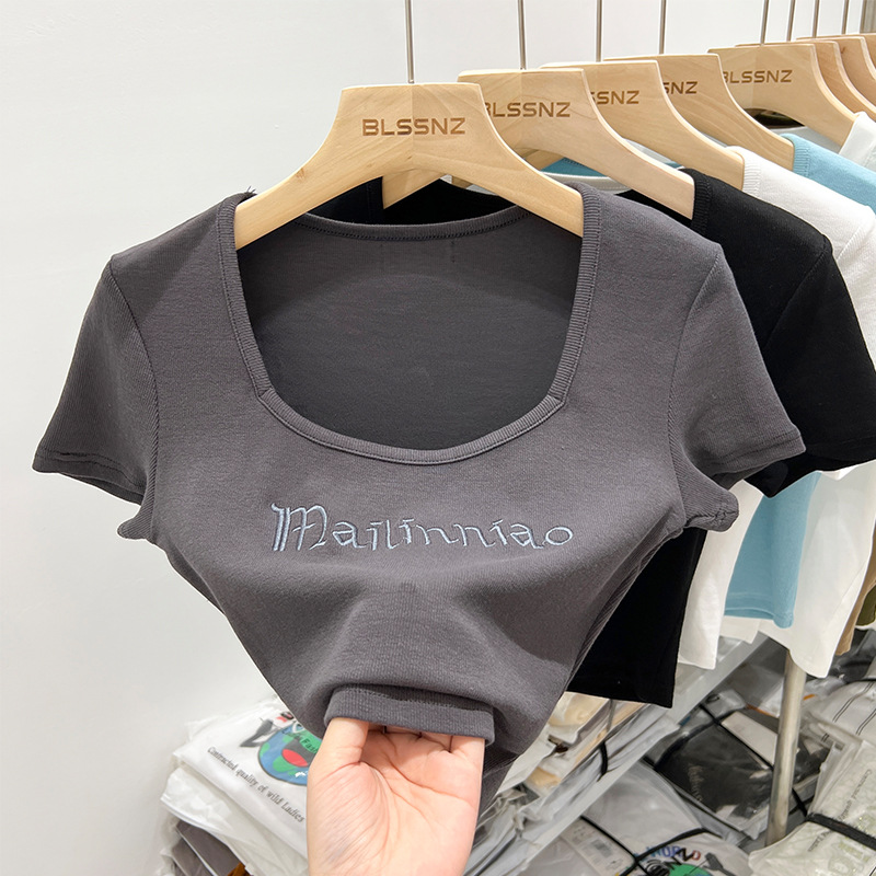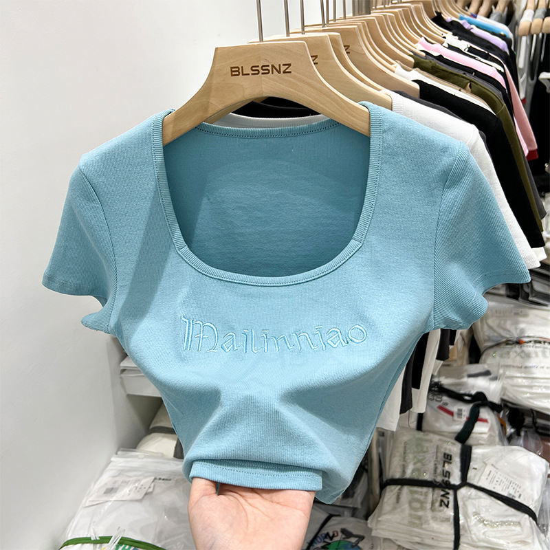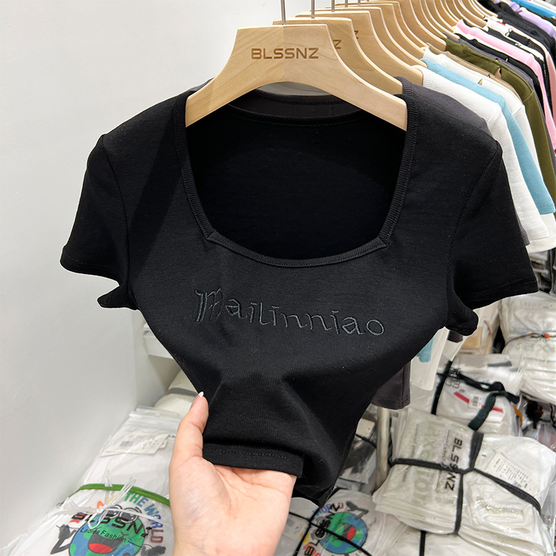 大领口刺绣短袖t恤女短袖夏季新款修身美式甜辣短款方领上衣