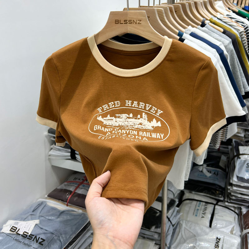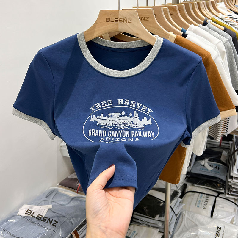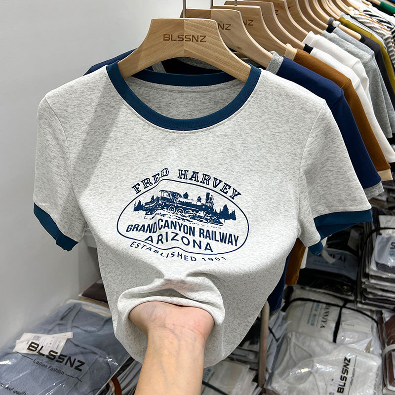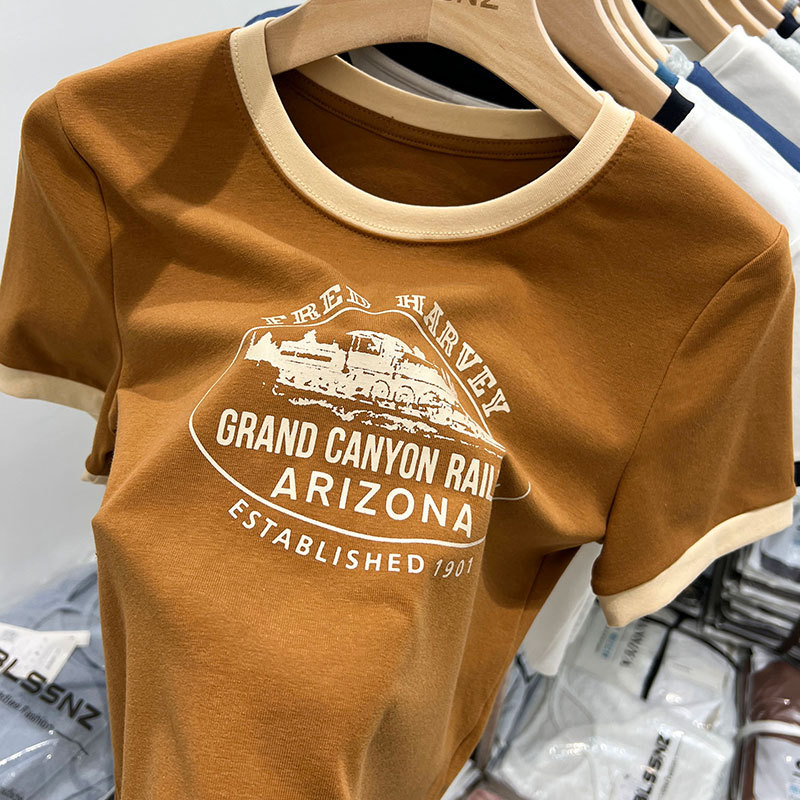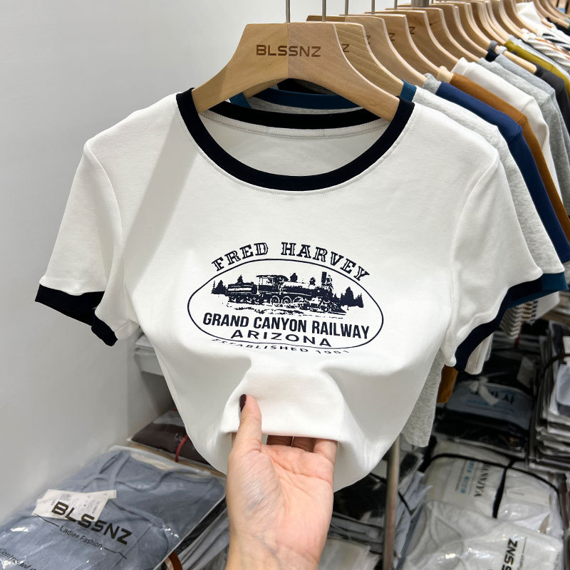 美式撞色印花短袖t恤女设计感小众夏季修身chic港味短款上衣体恤