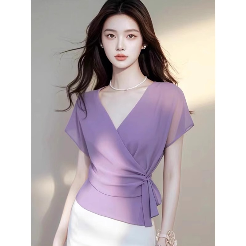 紫色短袖衬衫女2025新款夏季收腰小衫v领洋气高级感气质雪纺上衣