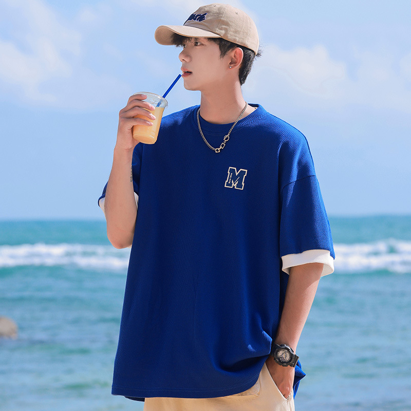 华夫格短袖t恤男夏季美式潮牌字母绣花半袖体恤上衣休闲男装