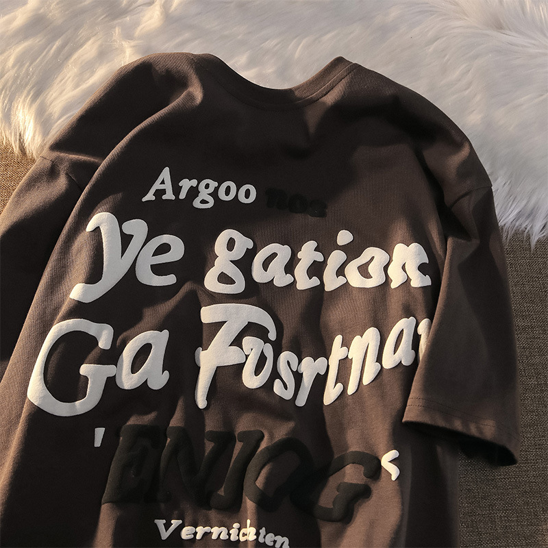 2025年新款发泡字母情侣装夏季宽松咖色t恤男ins潮牌美式复古短袖