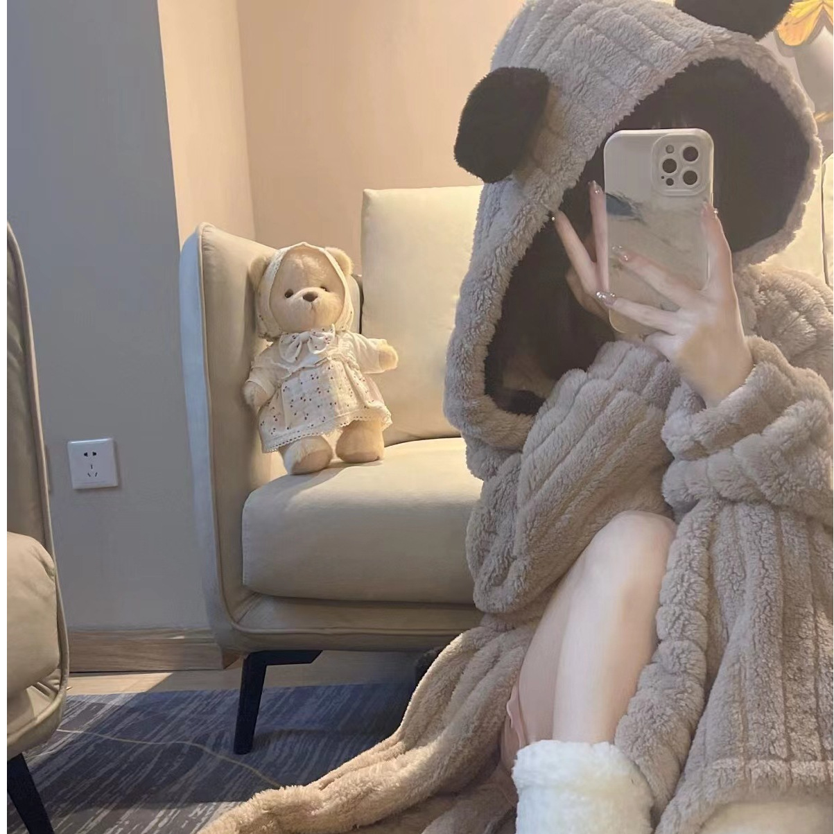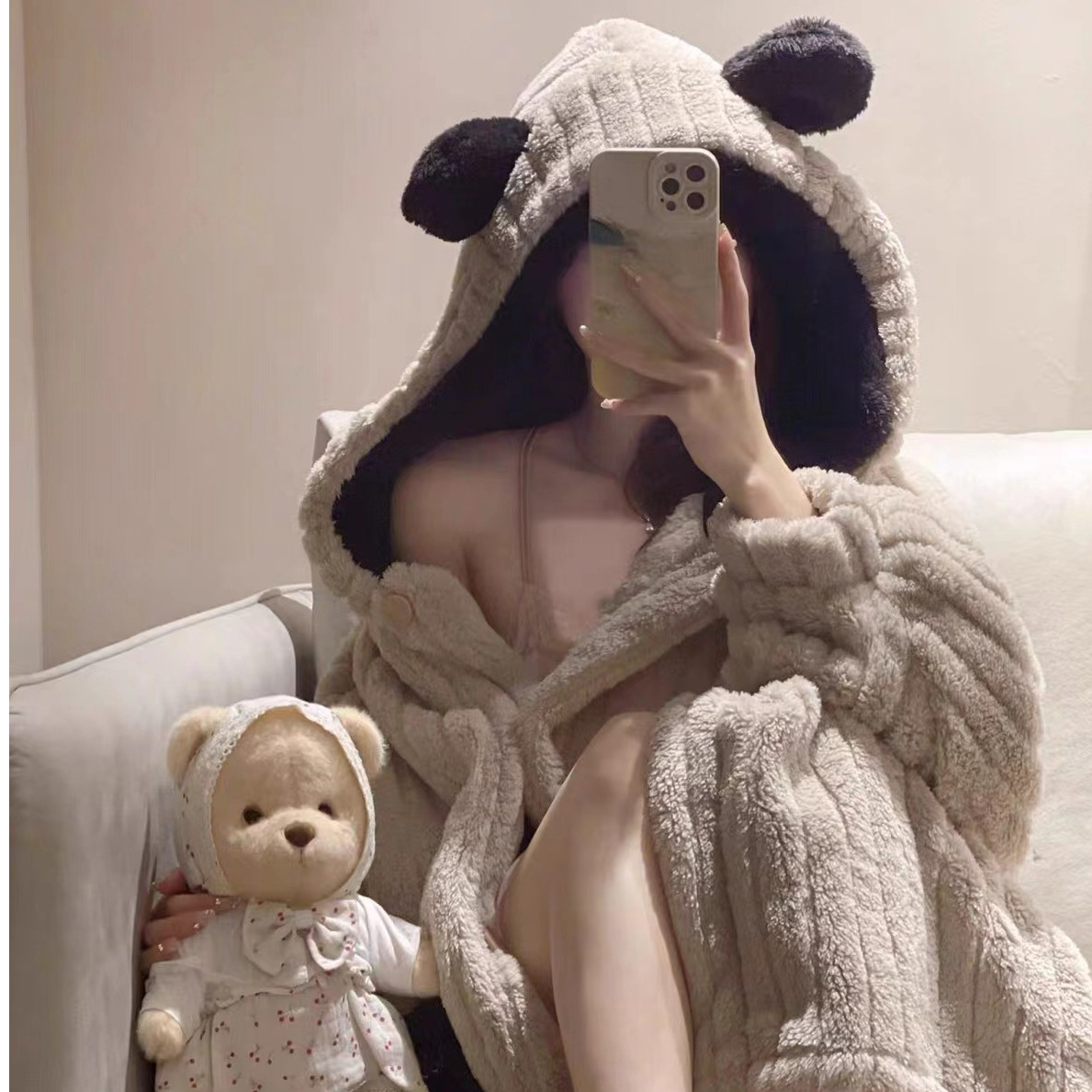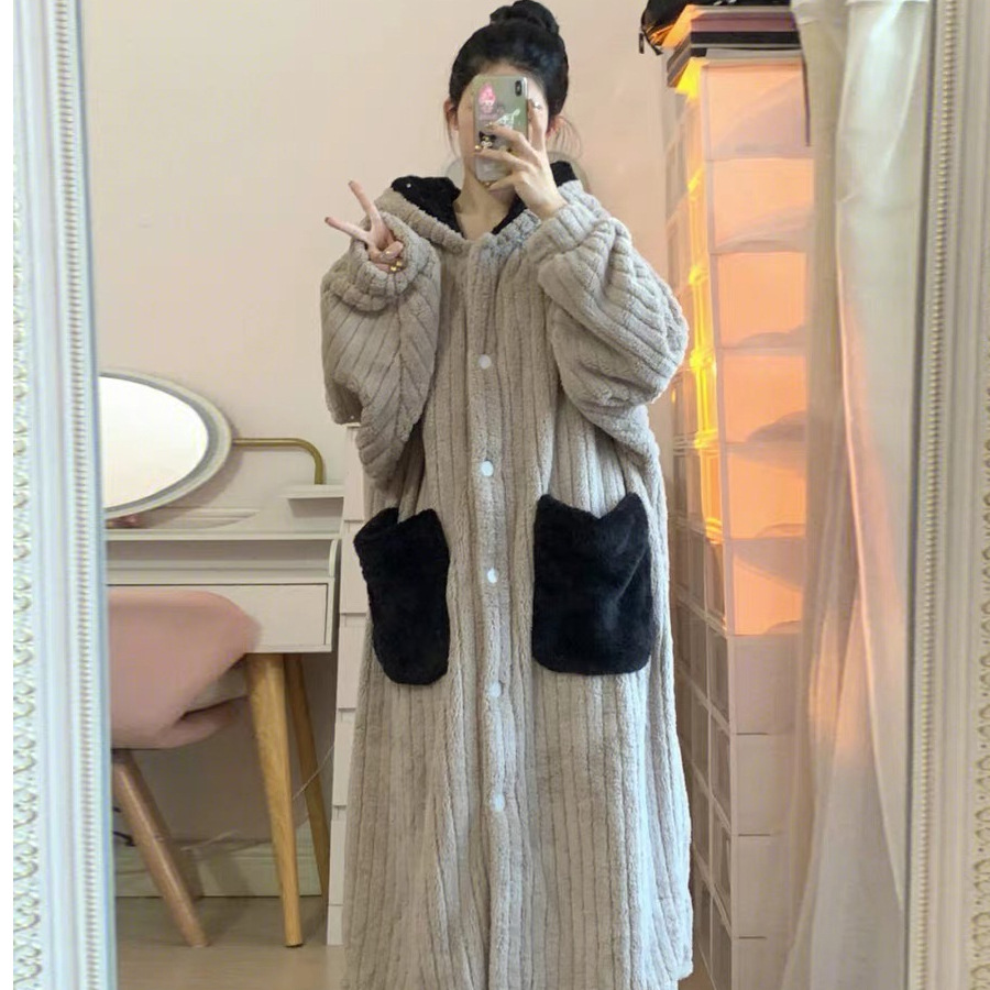 睡袍女冬季条纹长款宽松连帽熊耳朵加绒加厚浴袍珊瑚绒睡衣