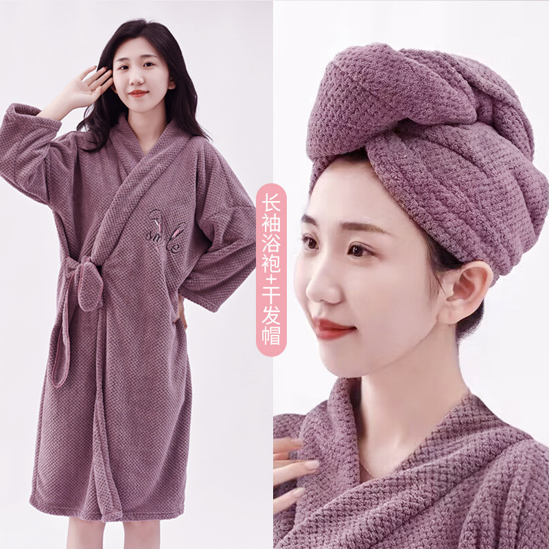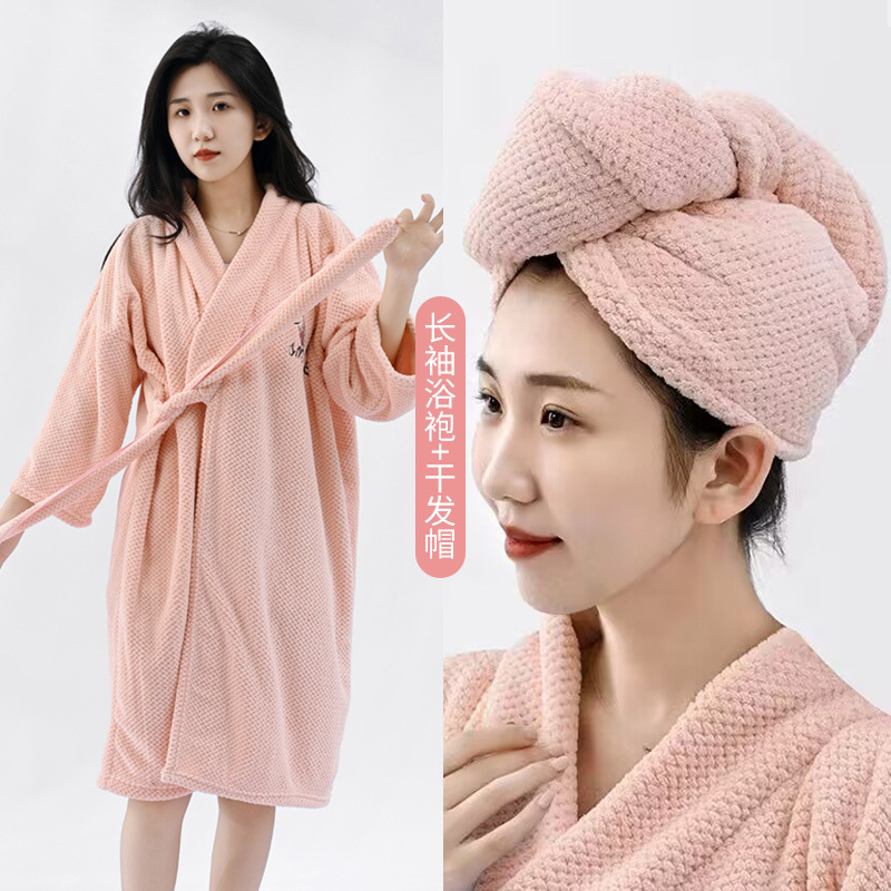 系带长袖短袖加厚浴袍女珊瑚绒可裹式速干浴帽秋冬家居服睡袍
