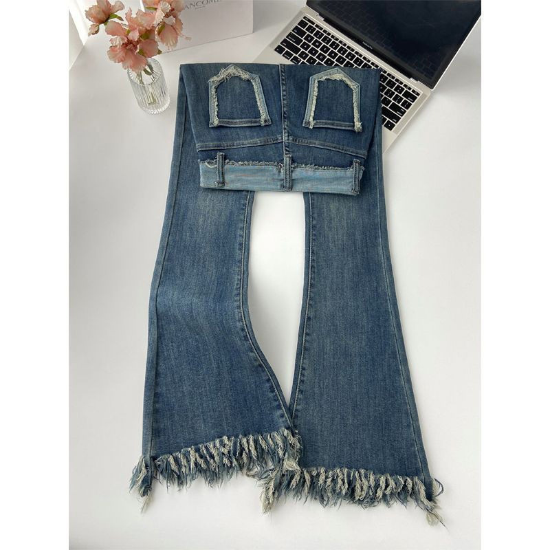 夏季新款高腰流苏微喇叭牛子裤女弹力修身复古毛边显瘦马蹄裤