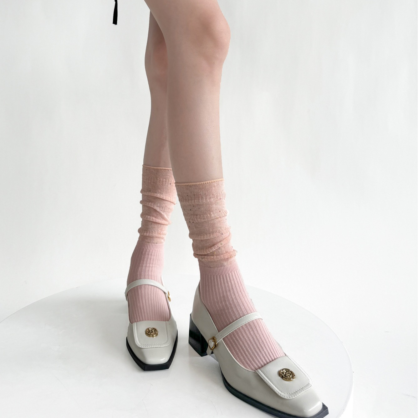 春夏季韩系彩点小腿袜薄款堆堆中筒袜半透拼接泡泡甜美小众少女袜