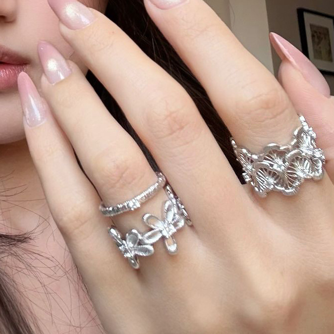 小红书爆款拉丝小花戒指时尚韩版银色蕾丝镂空叠戴指环一件代发