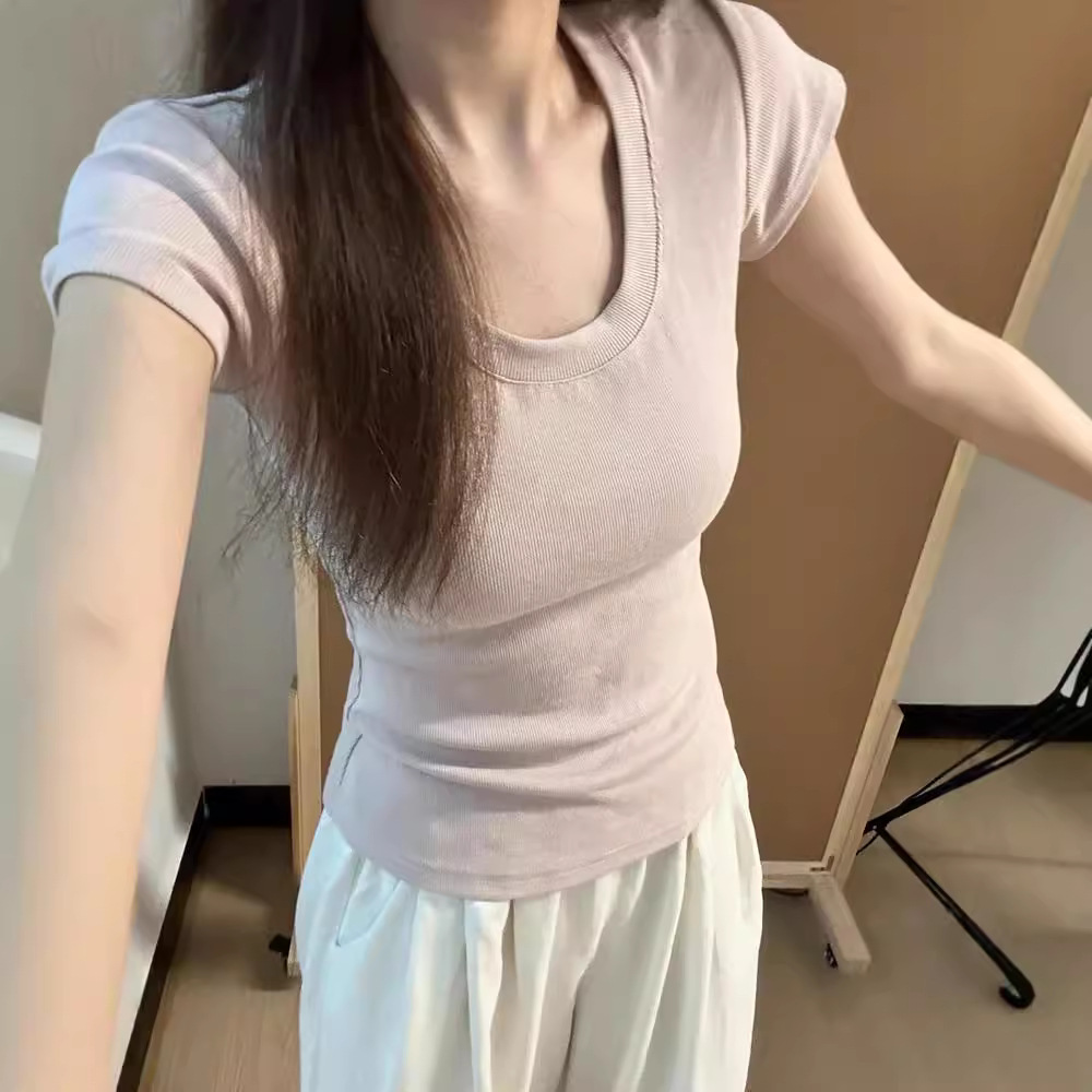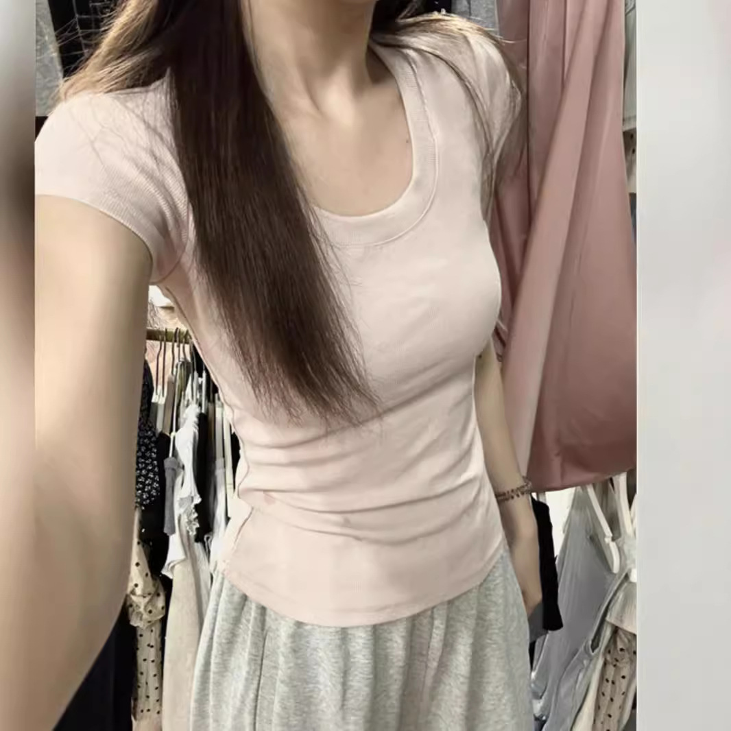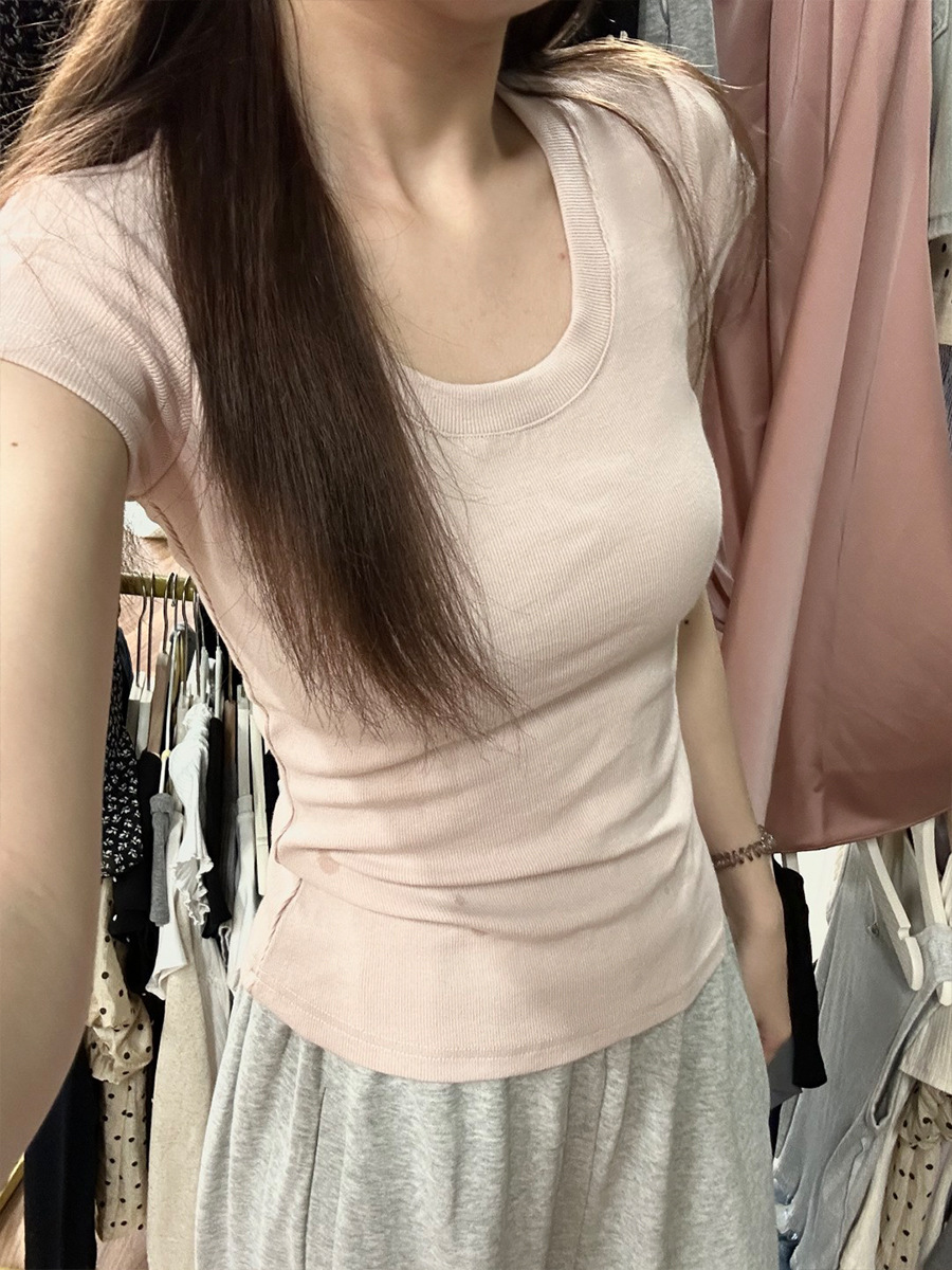 少女感粉色U领短袖上衣女夏季螺纹修身显瘦纯欲风百搭正肩T恤